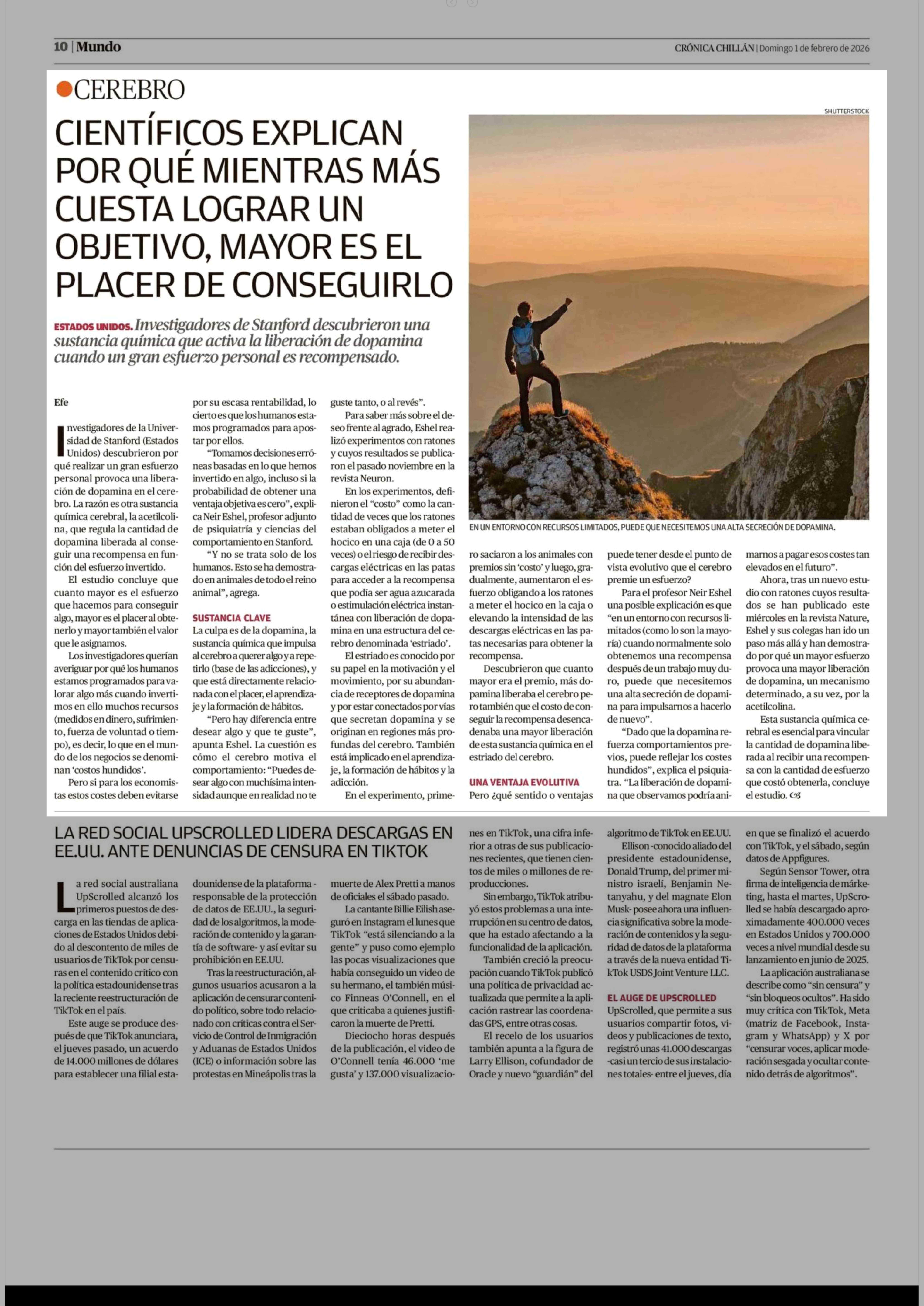 CIENTÍFICOS EXPLICAN POR QUÉ MIENTRAS MÁS CUESTA LOGRAR UN OBJETIVO, MAYOR ES EL PLACER DE CONSEGUIRLO 01-02-2026 Crónica de Chillán |