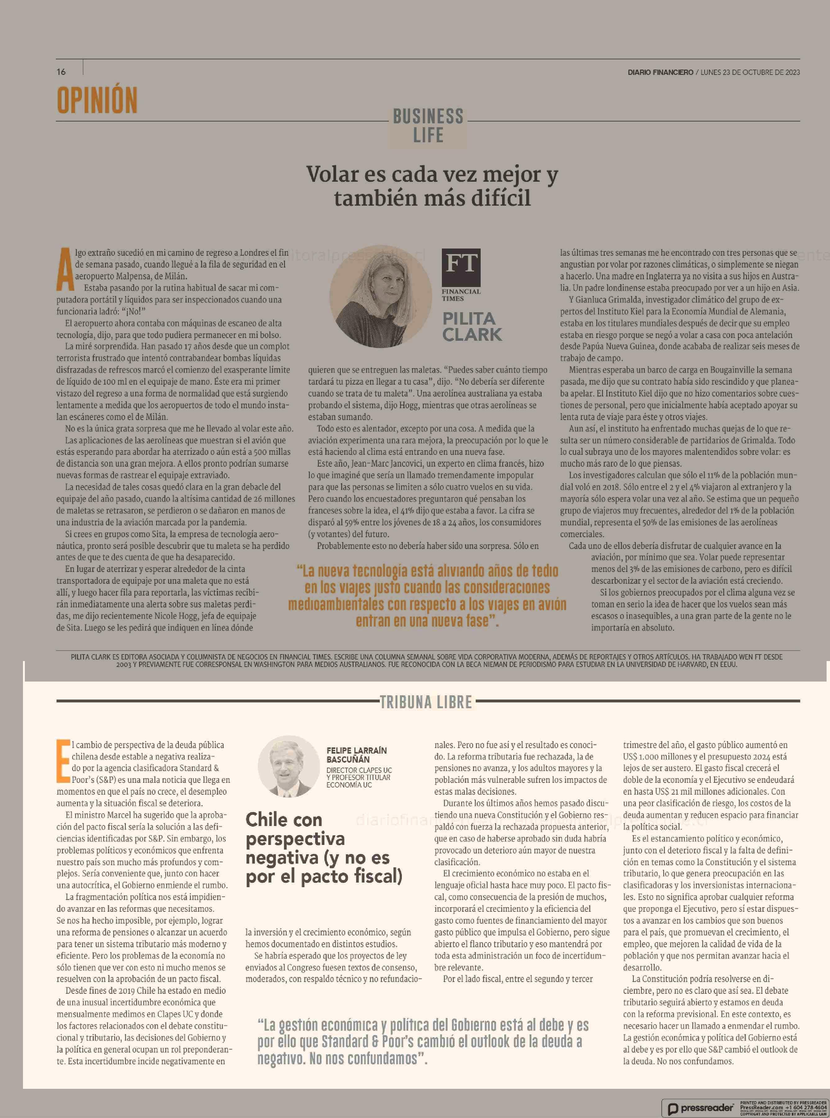 Chile con perspectiva negativa (y no es por el pacto fiscal) 23-10-2023 Diario Financiero |
