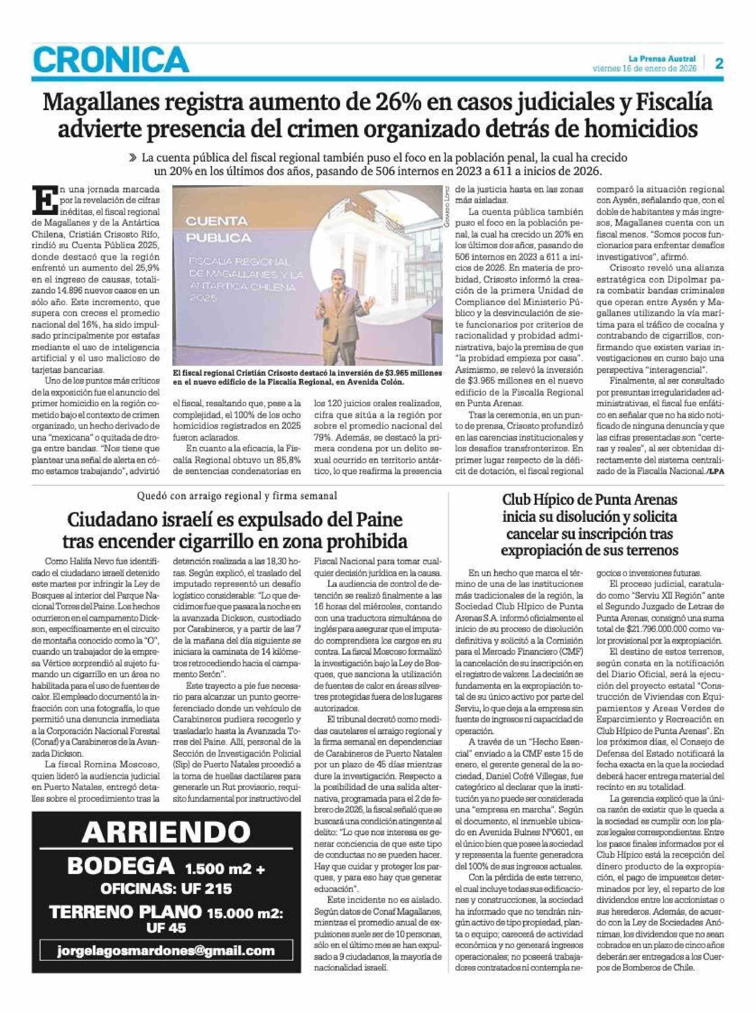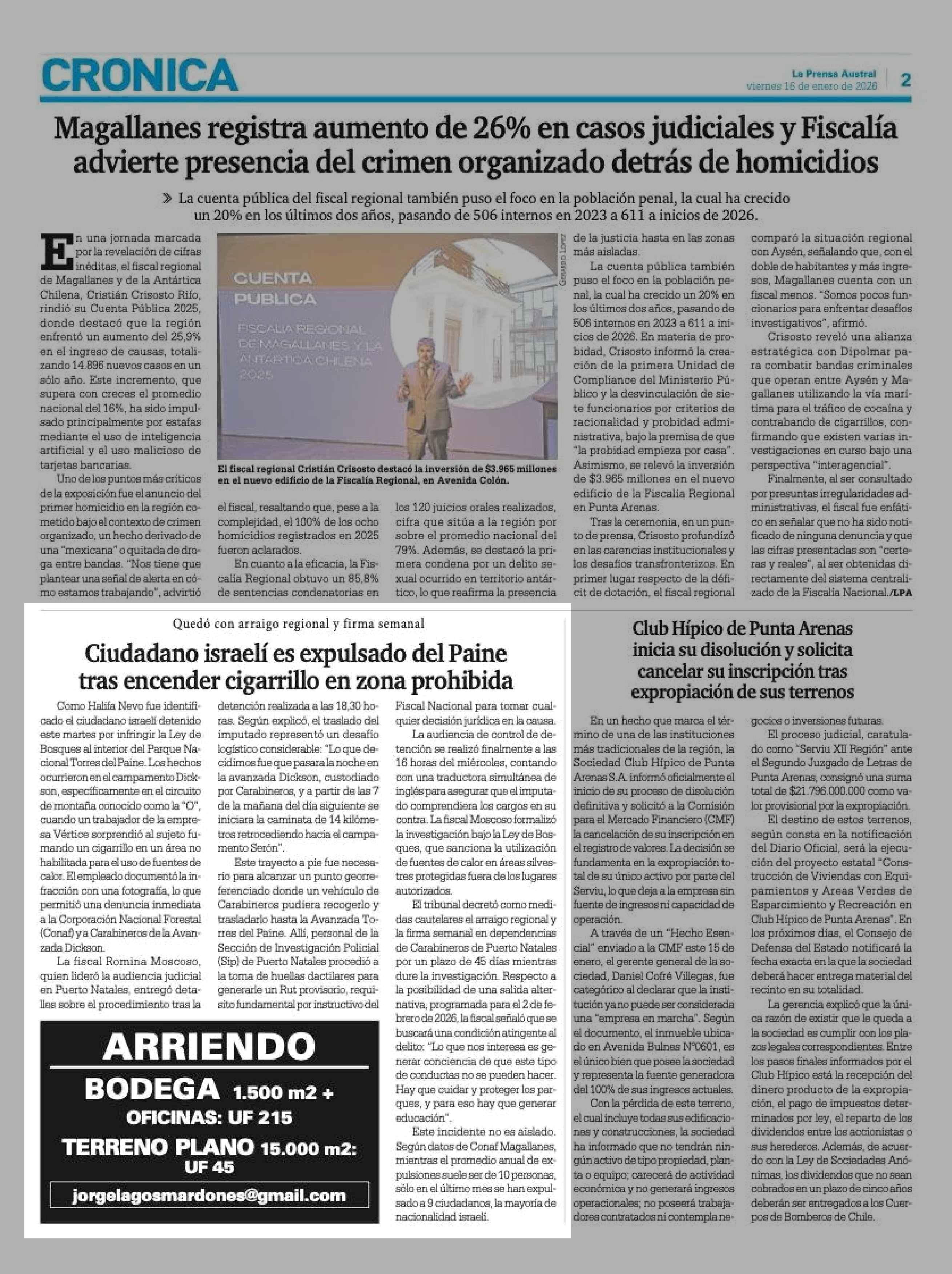 | Fecha: | 16-01-2026 | Sector: | Noticia general | Región: | Región de Magallanes y de la Antártica Chilena |