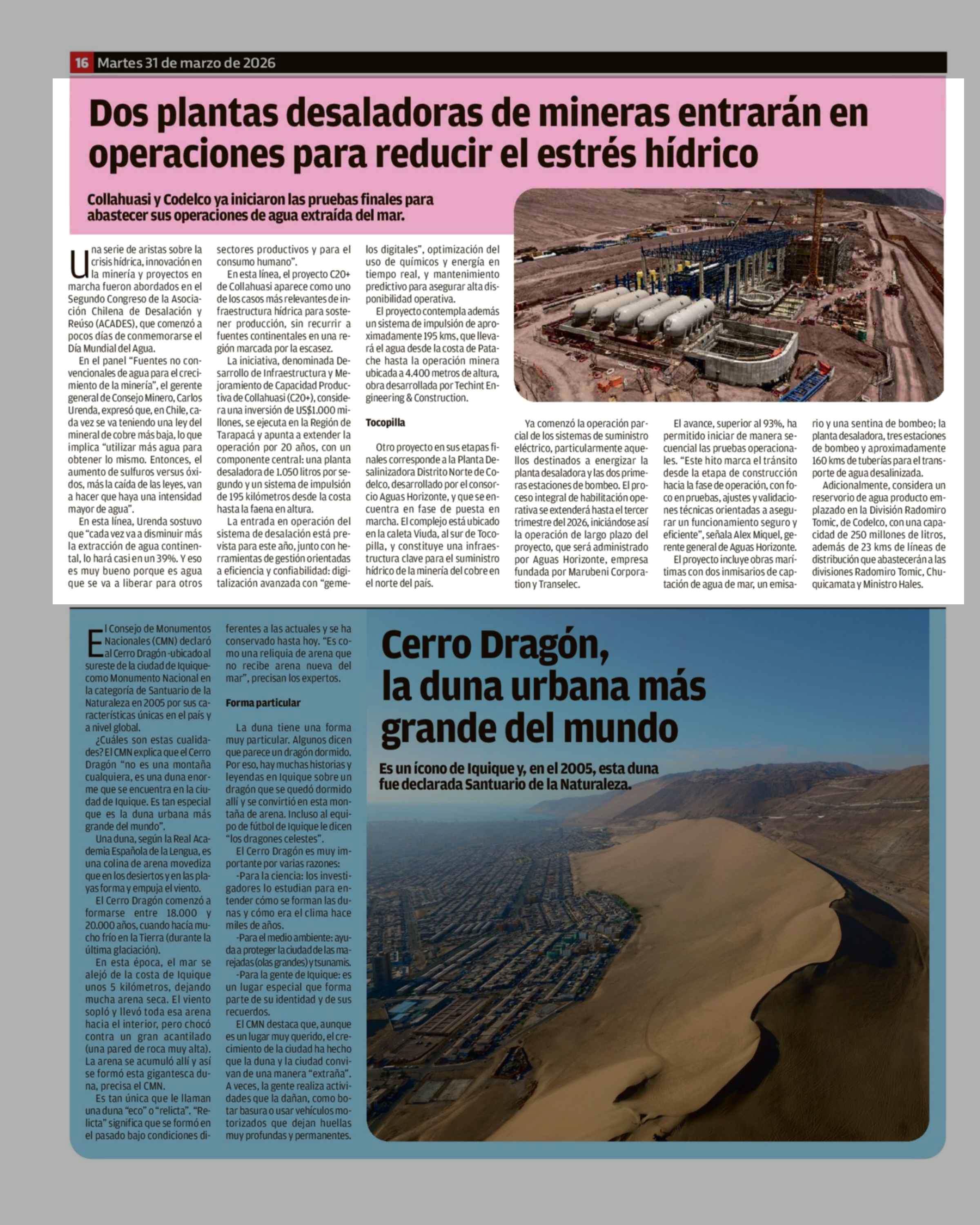 Dos plantas desaladoras de mineras entrarán en operaciones para reducir el estrés hídrico 31-03-2026 El Llanquihue |