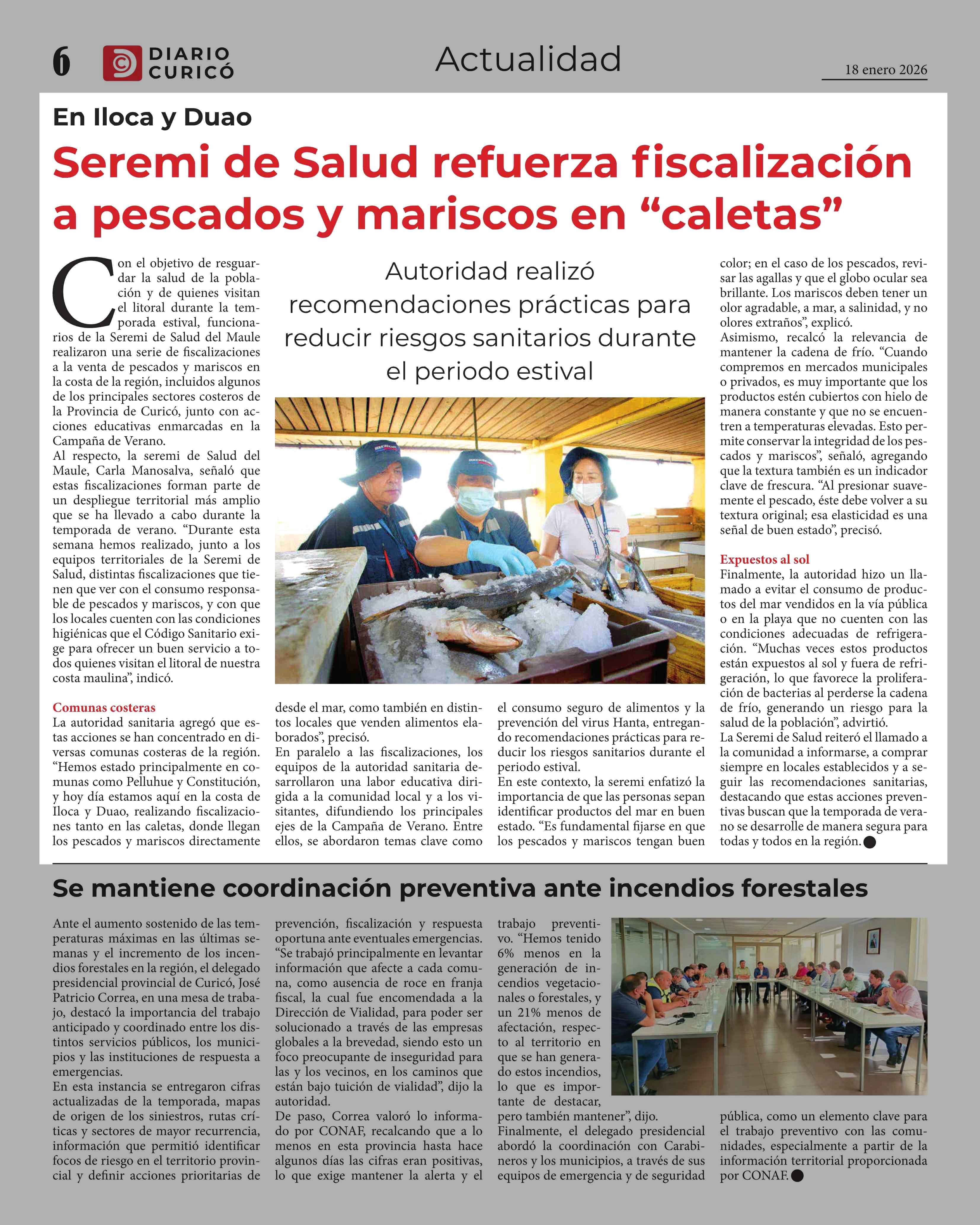 Seremi de Salud refuerza fiscalización a pescados y mariscos en "caletas" 18-01-2026 Diario Talca |