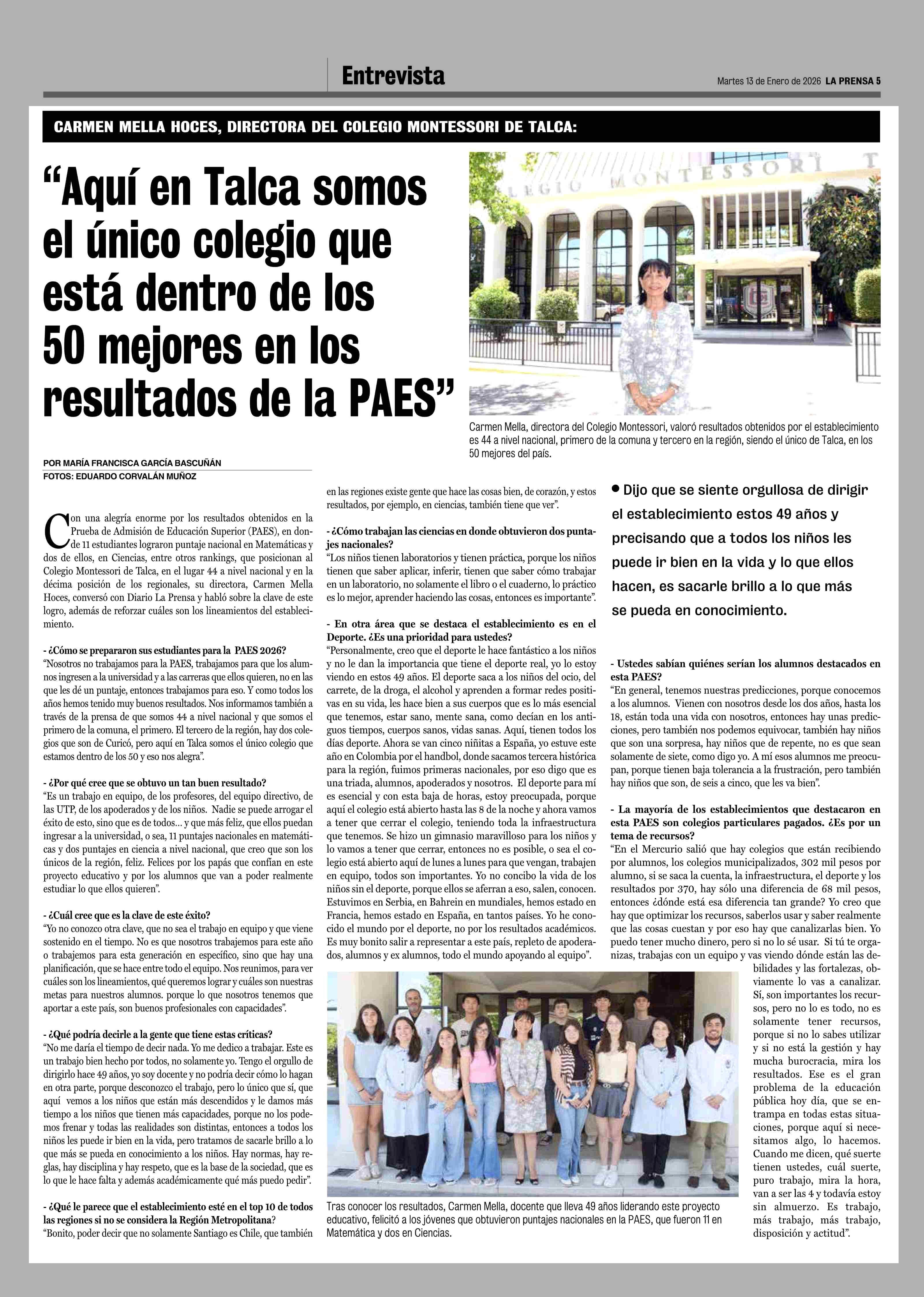 Título: "Aquí en Talca somos el único colegio que está dentro de los 50 mejores en los resultados de la PAES"