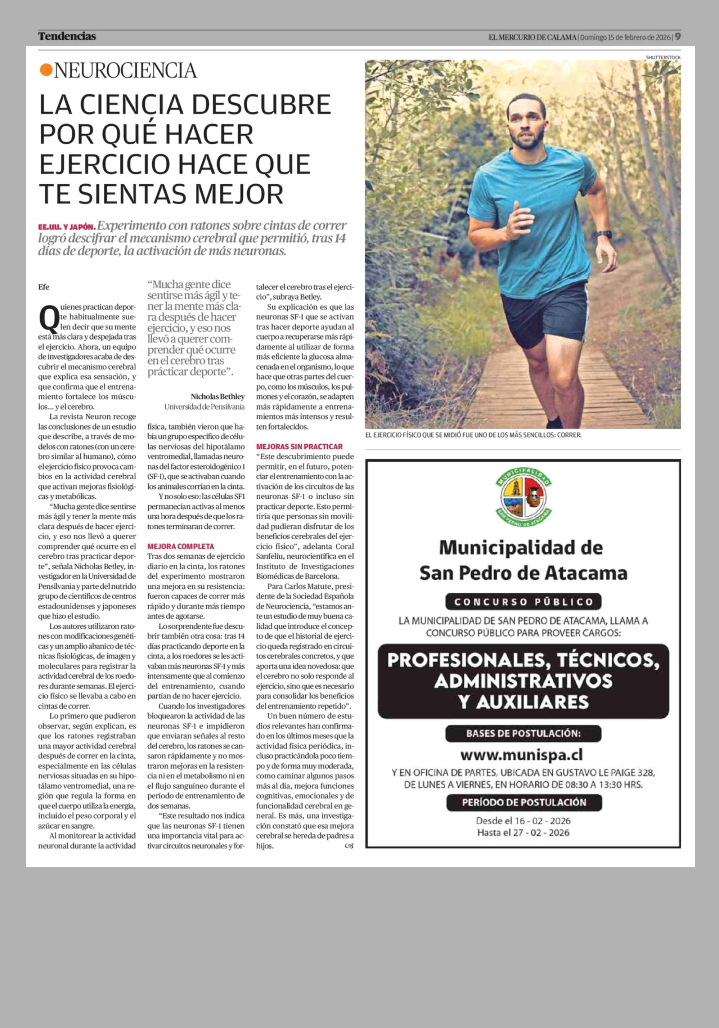 LA CIENCIA DESCUBRE POR QUÉ HACER EJERCICIO HACE QUE TE SIENTAS MEJOR 15-02-2026 El Mercurio de Calama |