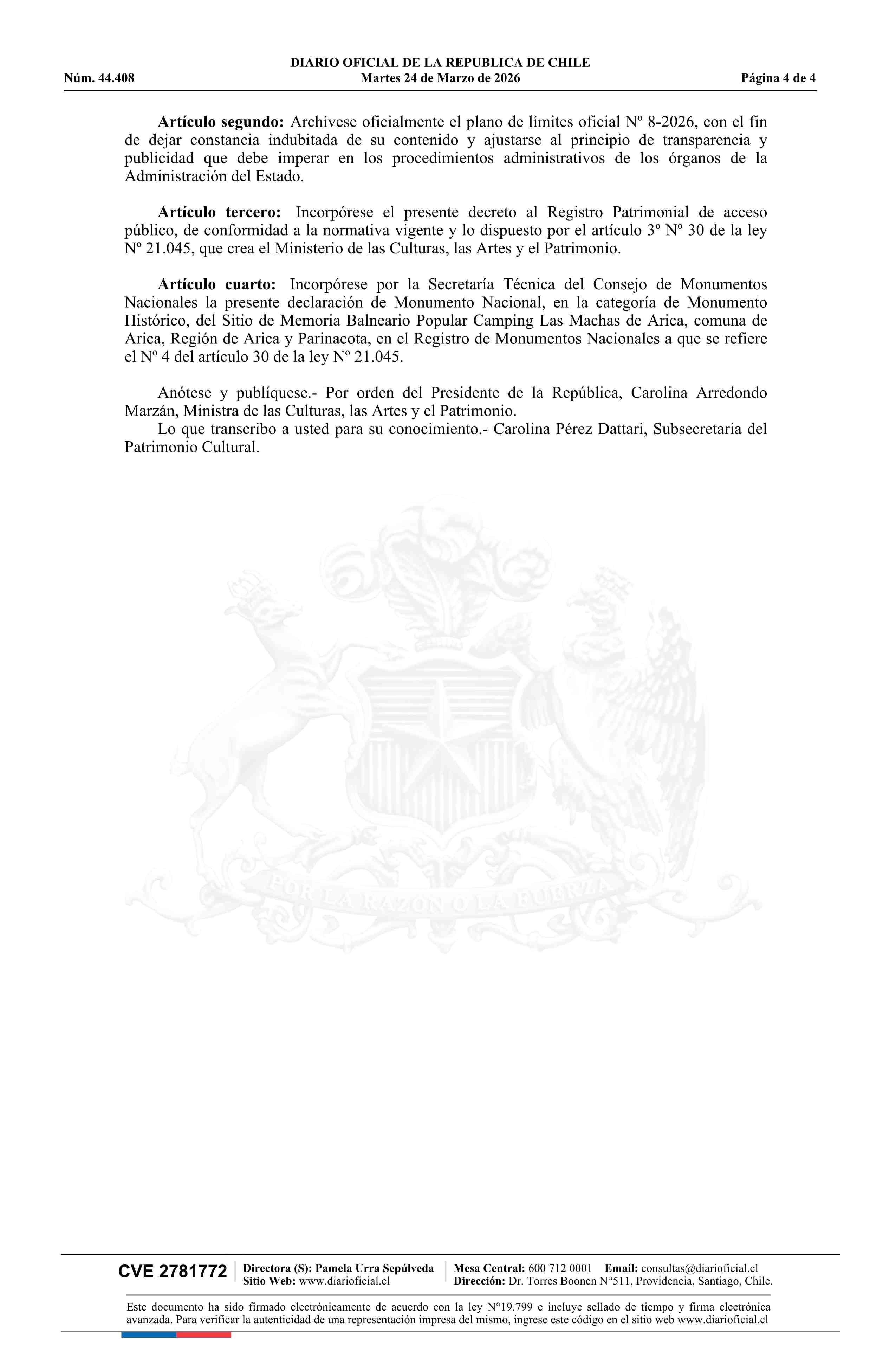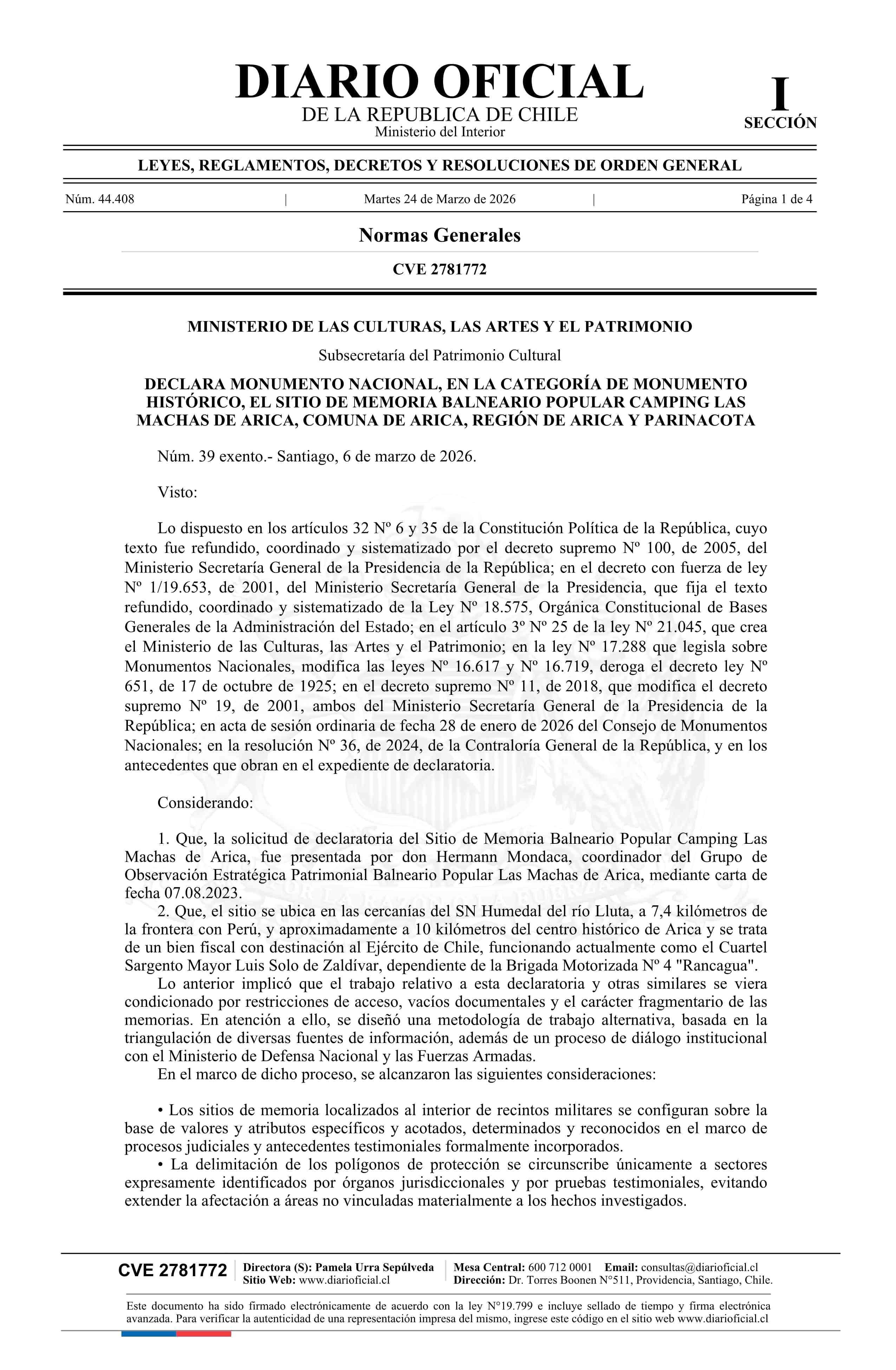 Título: Decreto exento número 39, de 2026.- Declara Monumento Nacional, en la categoría de Monumento Histórico, el Sitio de Memoria Balneario Popular Camping Las Machas de Arica, comuna de Arica, Región de Arica y Parinacota