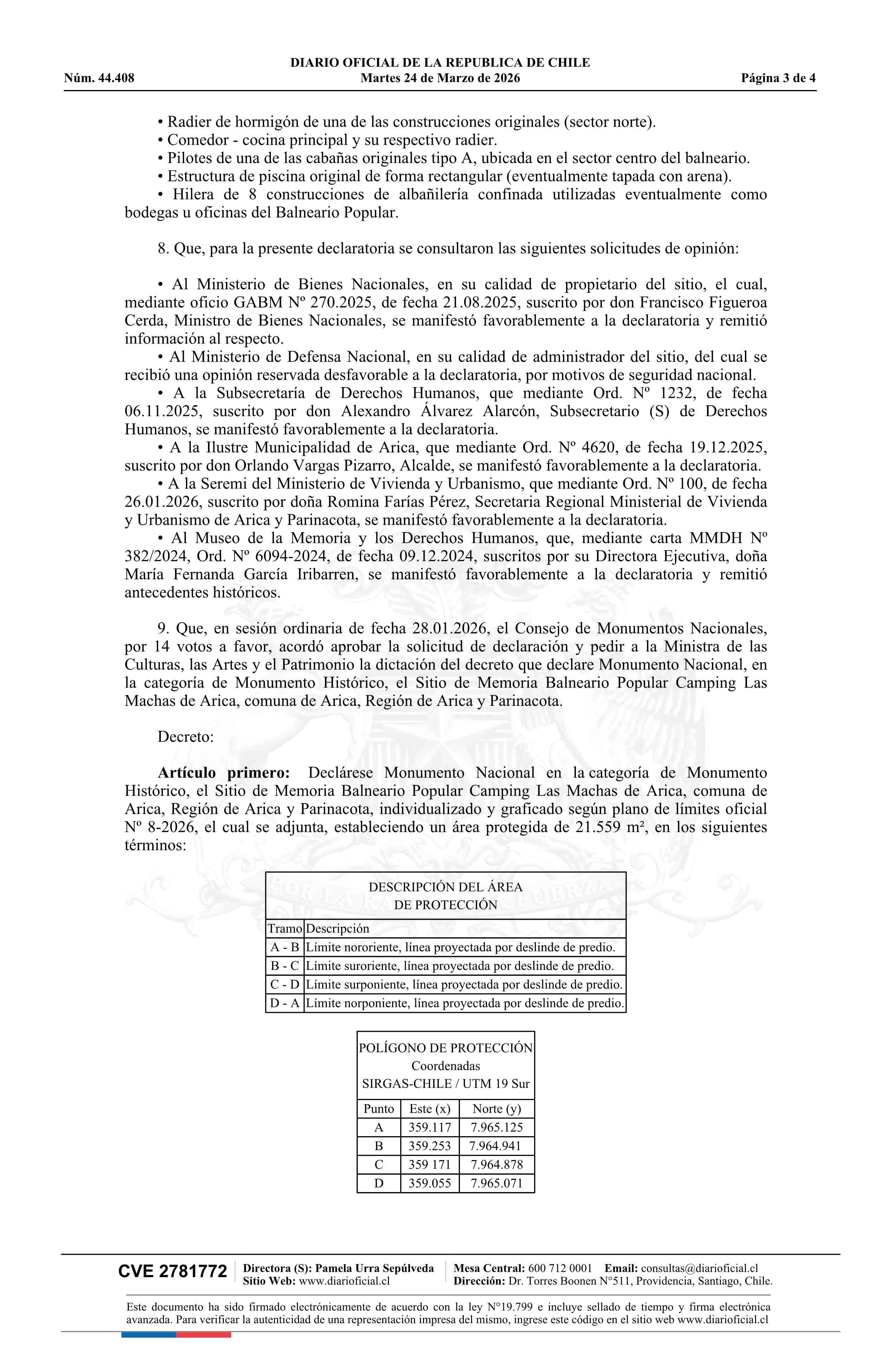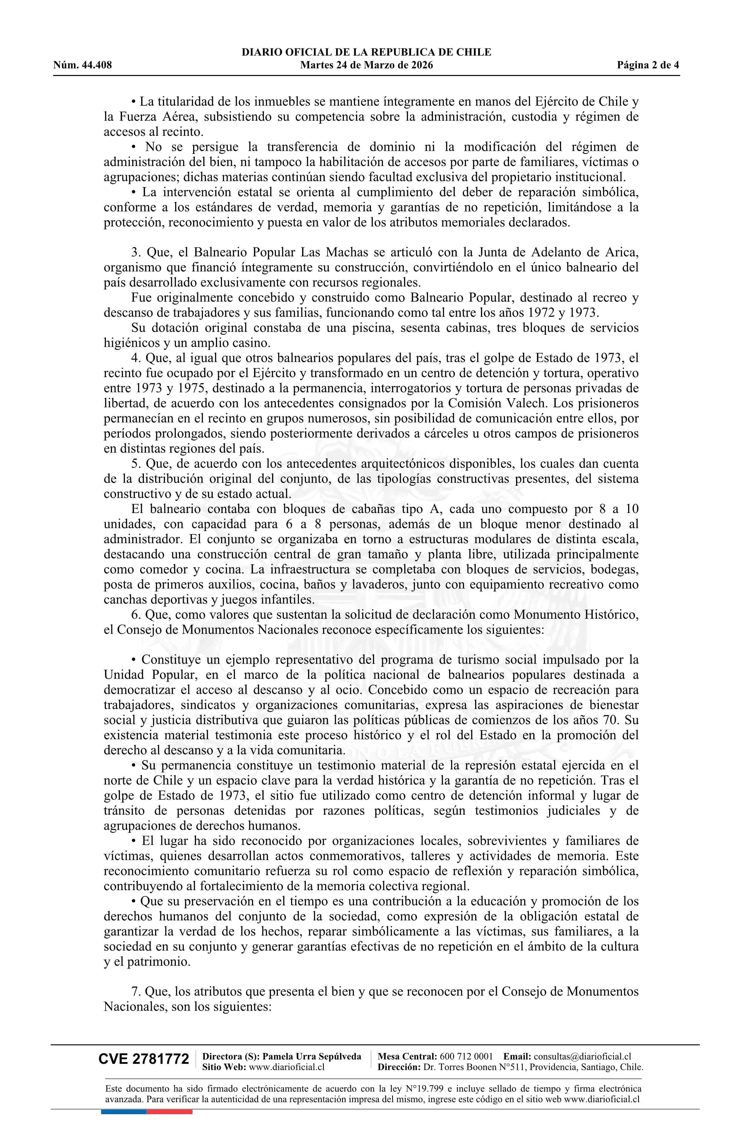 Decreto exento número 39, de 2026.- Declara Monumento Nacional, en la categoría de Monumento Histórico, el Sitio de Memoria Balneario Popular Camping Las Machas de Arica, comuna de Arica, Región de Arica y Parinacota