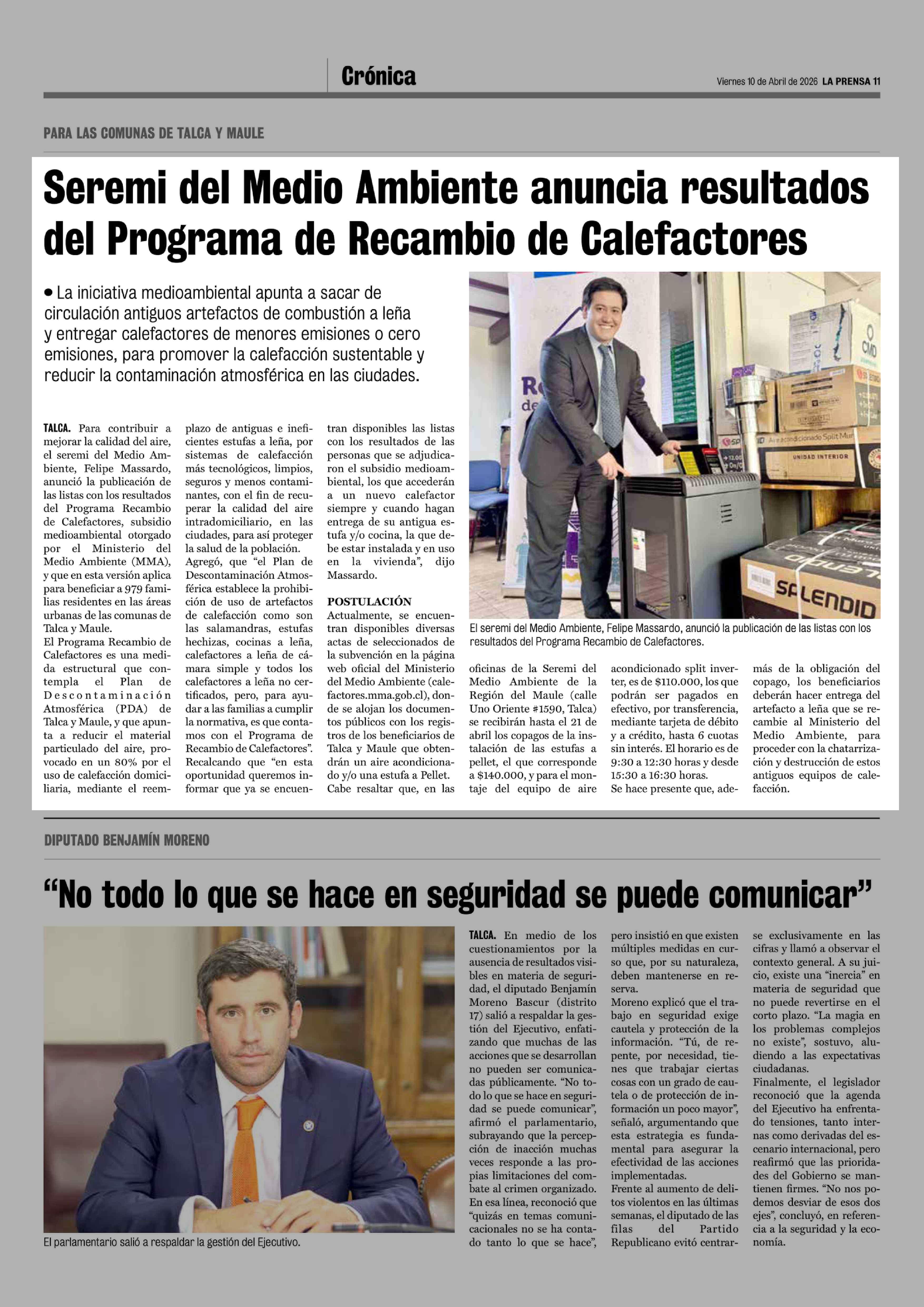 Seremi del Medio Ambiente anuncia resultados del Programa de Recambio de Calefactores 10-04-2026 La Prensa de Curicó |