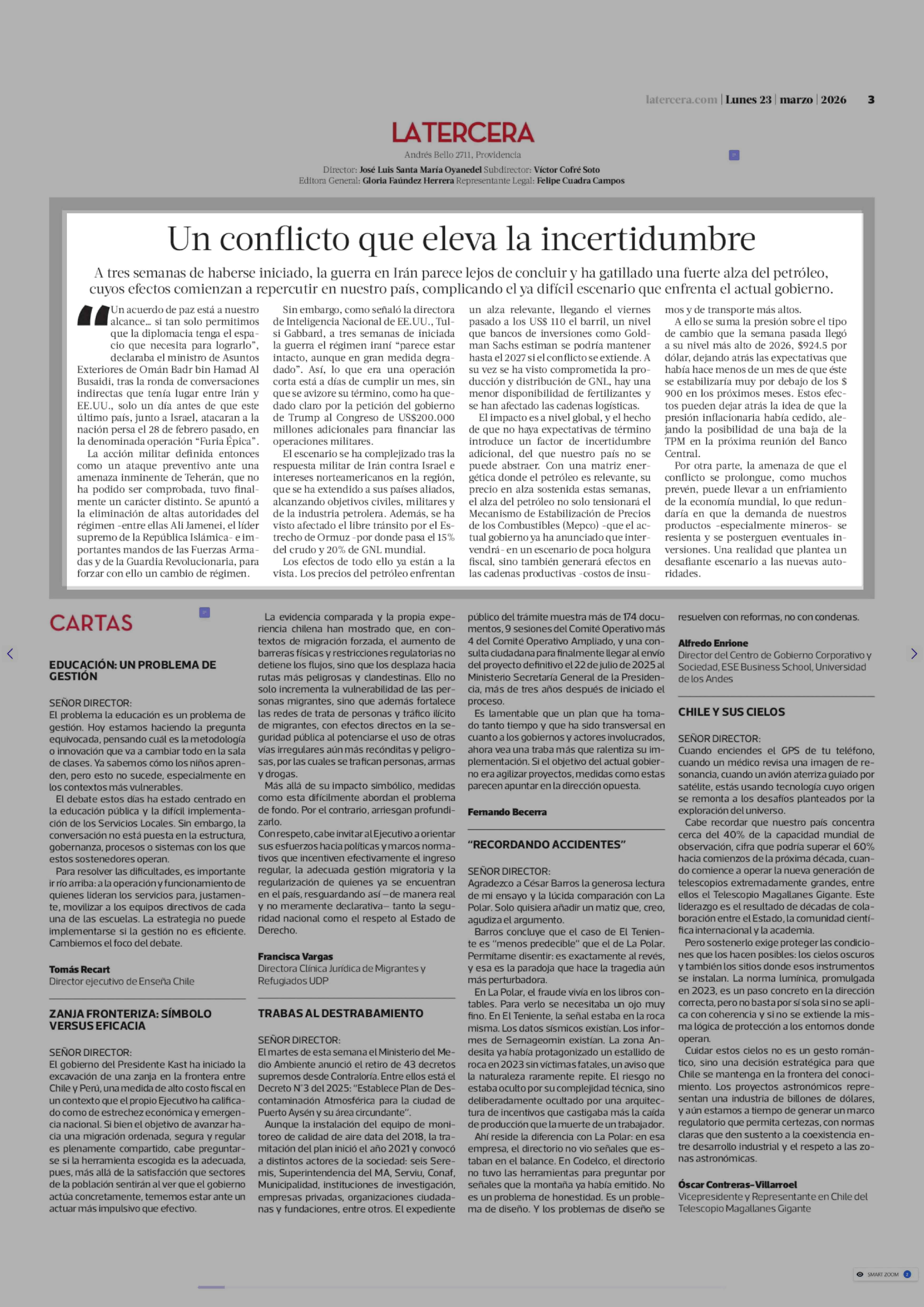 Editorial: Un conflicto que eleva la incertidumbre 23-03-2026 La Tercera |