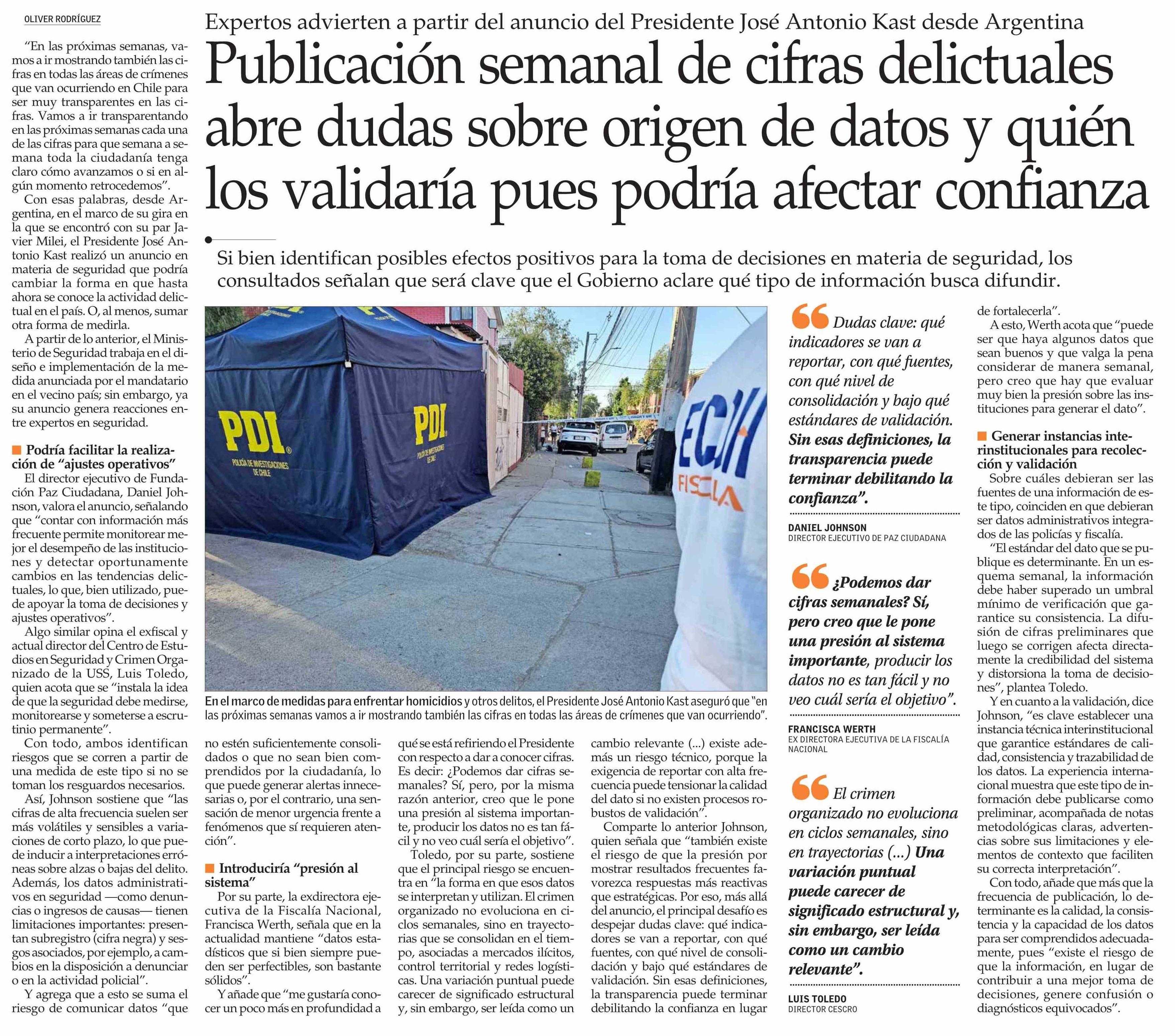 Título: Publicación semanal de cifras delictuales abre dudas sobre origen de datos y quién los validaría pues podría afectar confianza
