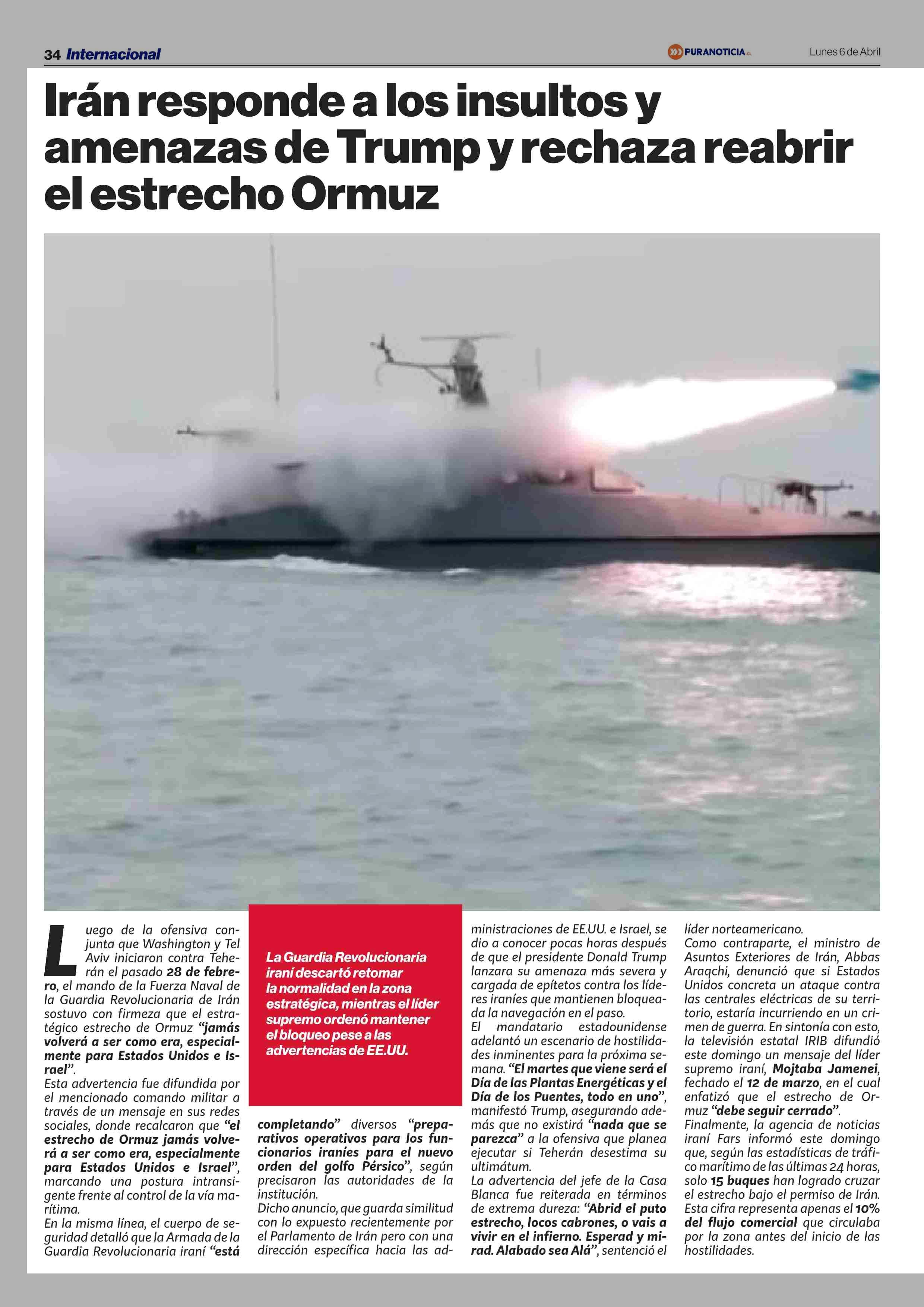 Irán responde alos insultos y amenazas de Trump y rechaza reabrir el estrecho Ormuz 06-04-2026 Puranoticia.cl |