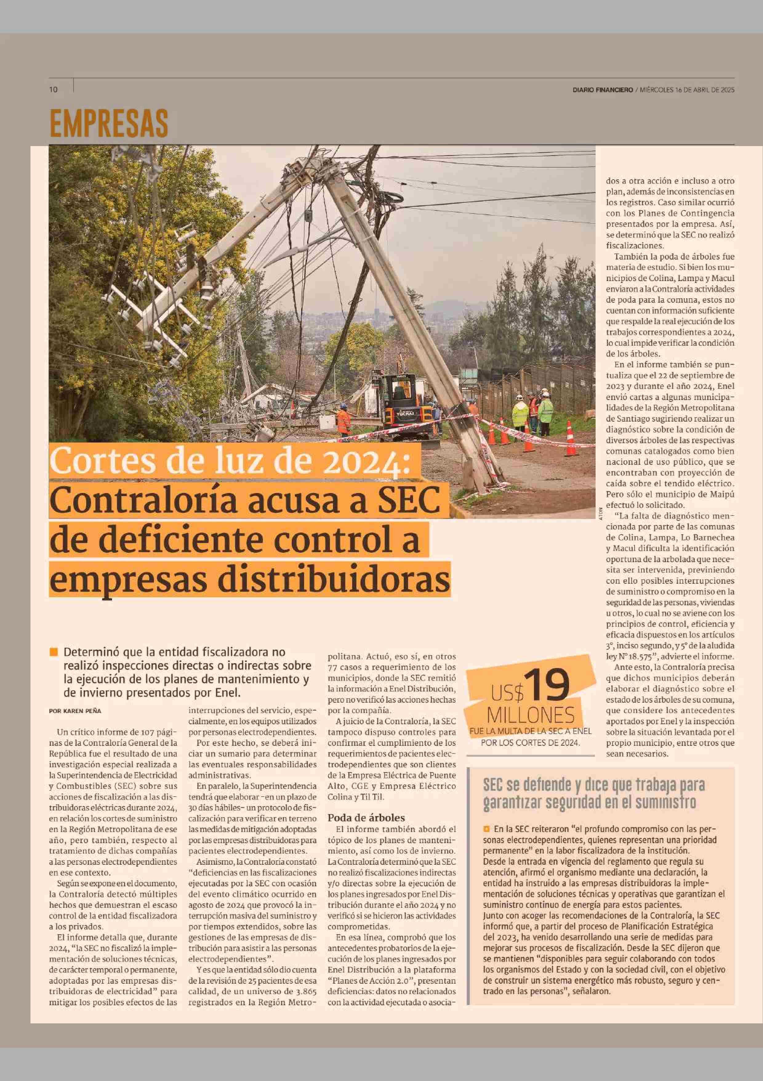 Cortes de luz de 2024: Contraloria acusa a SEC. de deficiente control a empresas distribuidoras 16-04-2025 Diario Financiero |