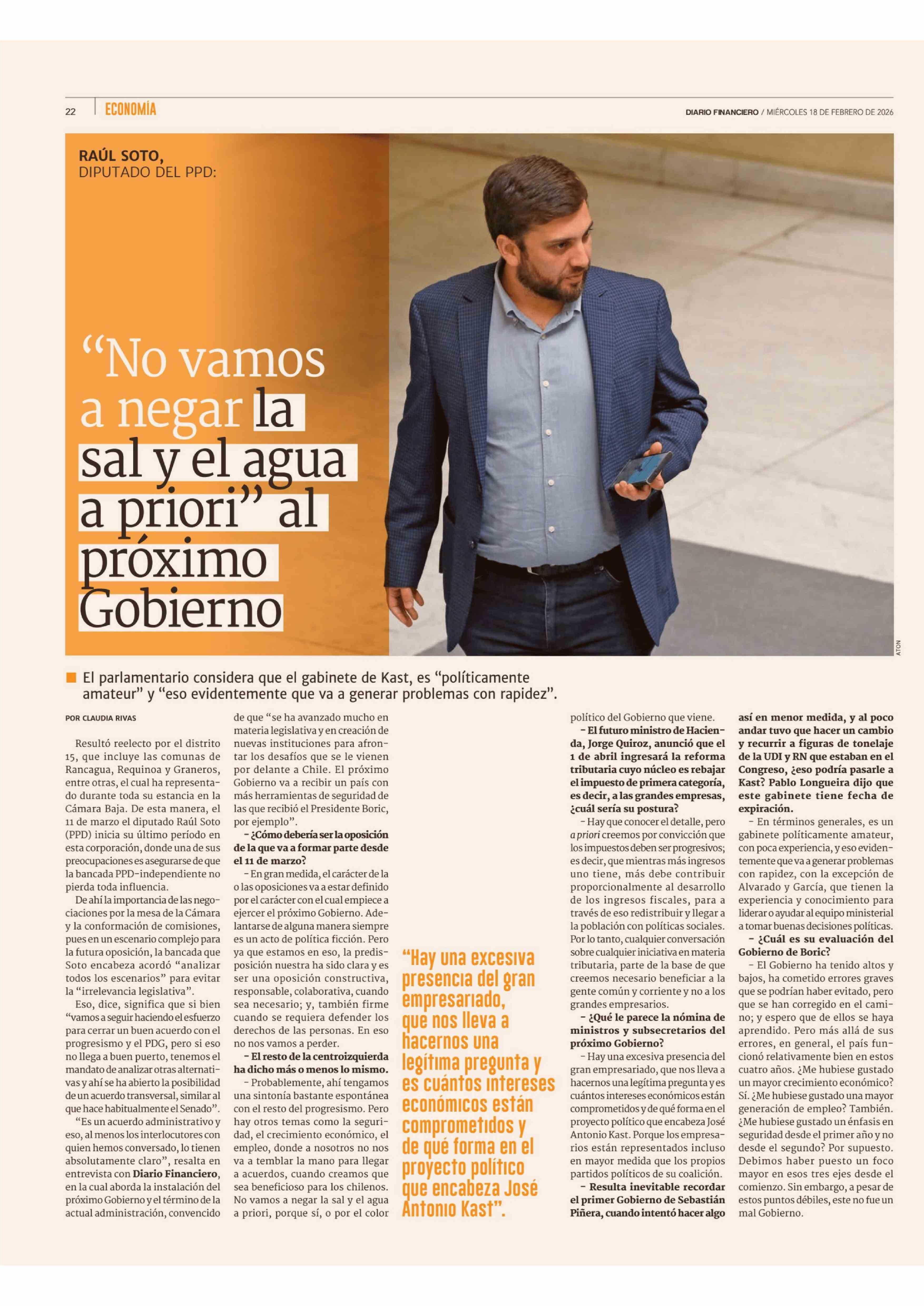 "No vamos a negar la sal y el agua a priori" al proximo Gobierno 18-02-2026 Diario Financiero |