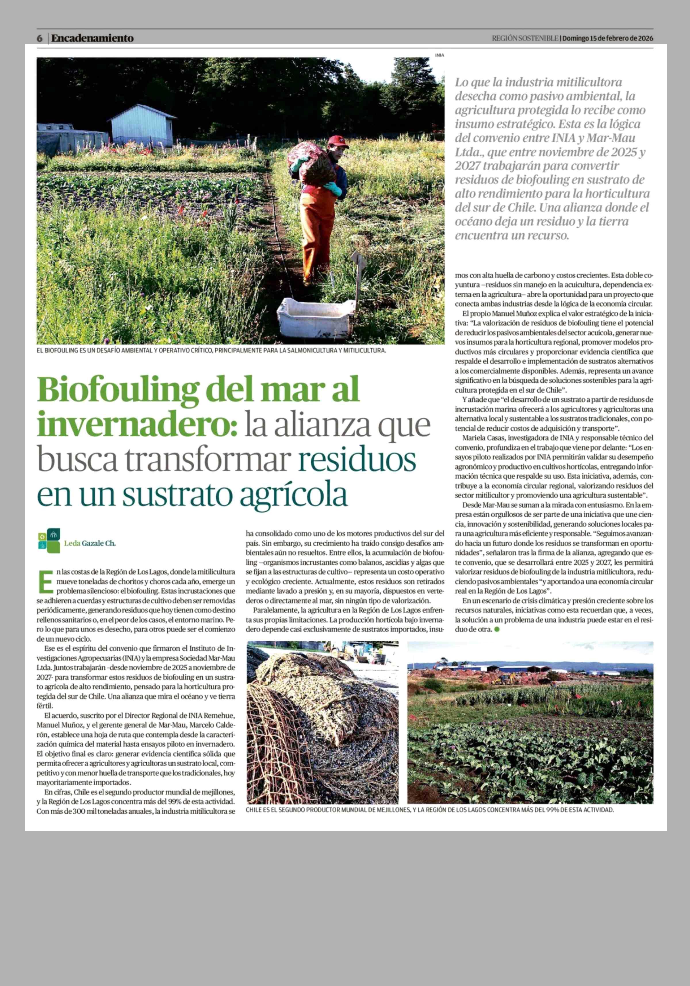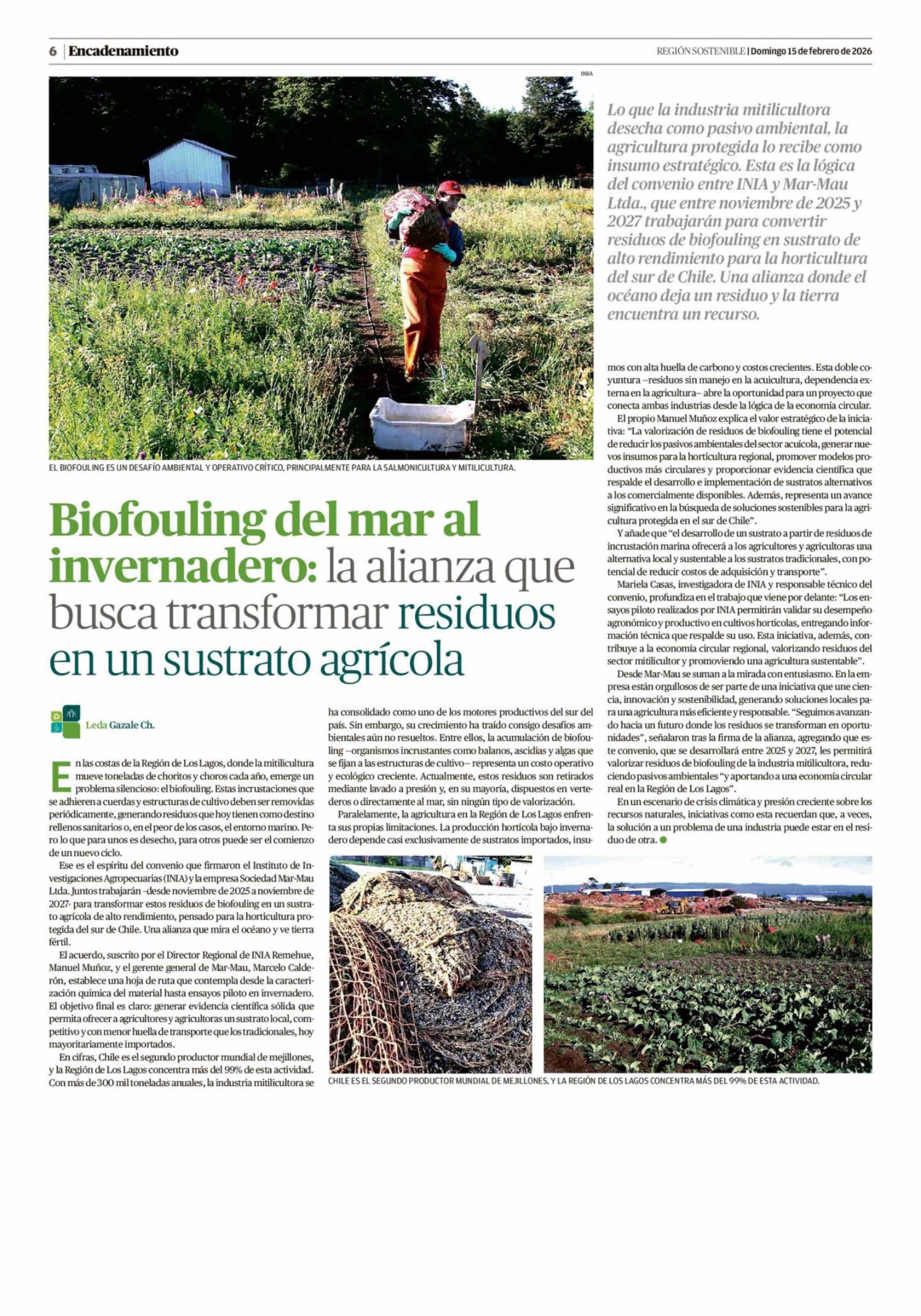 Biofouling del mar al invernadero: la alianza que busca transformar residuos en un sustrato agrícola 15-02-2026 El Austral de la Araucanía |