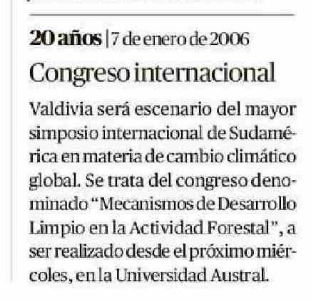 Título: 20 años |7 de enero de 2006 Congreso internacional Valdivia será escenario del mayor simposio internacional de Sudamérica en materia de cambio climático global. Se trata del congreso denominado "Mecanismos de Desarrollo Limpio en la Actividad Forestal", a ser realizado desde el próximo miércoles, en