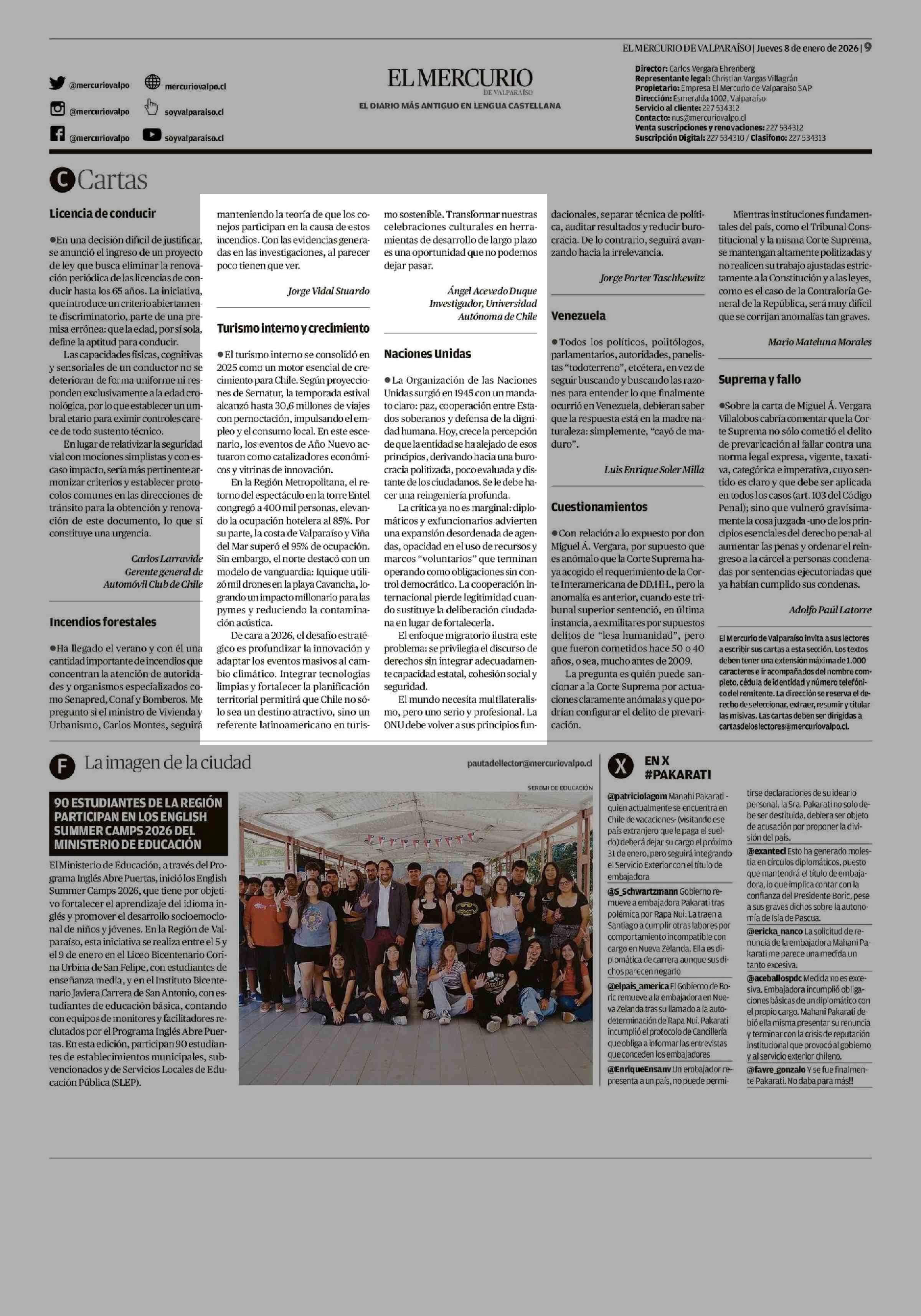 Cartas: Turismo interno y crecimiento 08-01-2026 El Mercurio de Valparaíso |