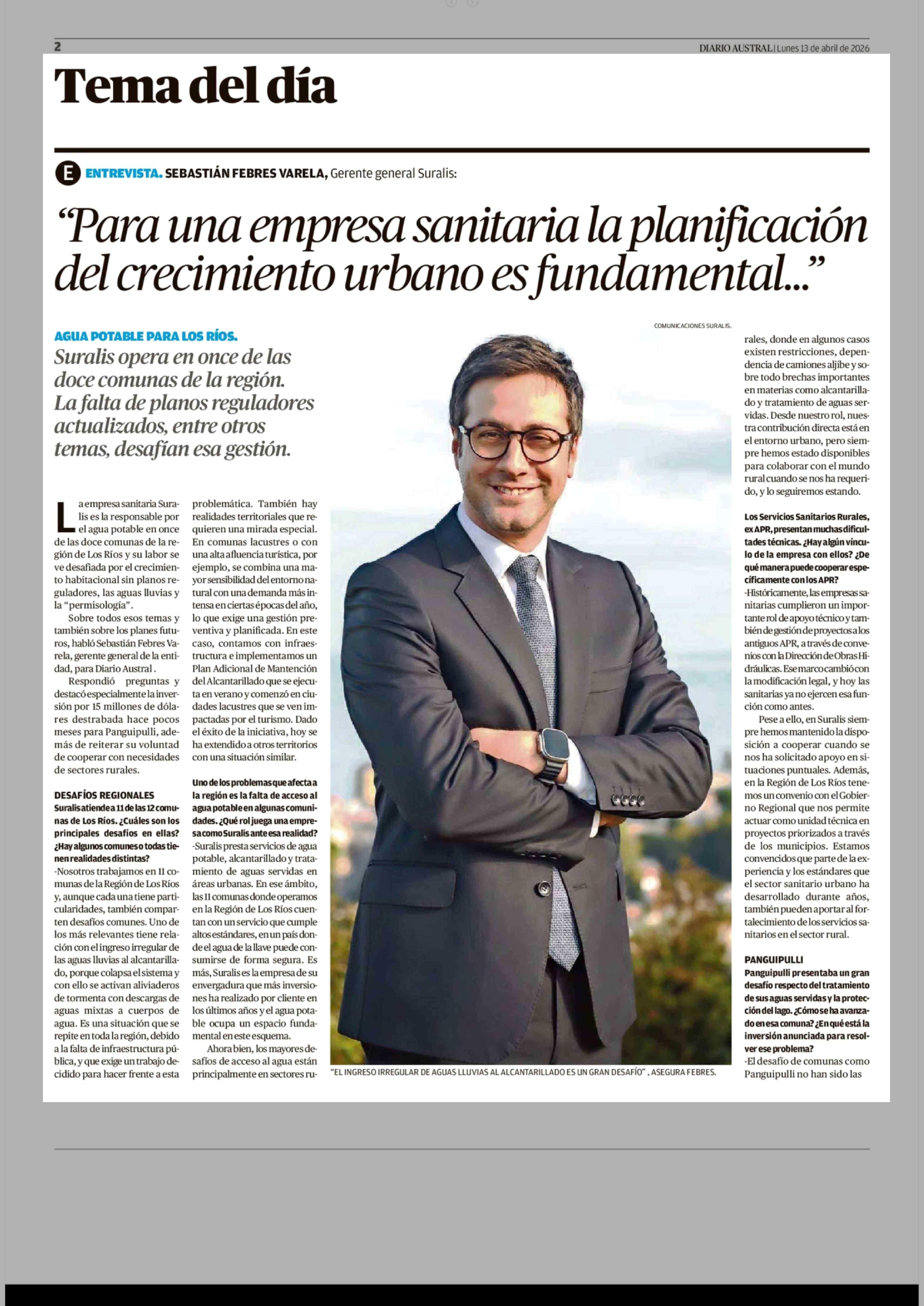 "Para una empresa sanitaria la planificación del crecimiento urbano es fundamental ... " 13-04-2026 Diario Austral Región de Los Ríos |