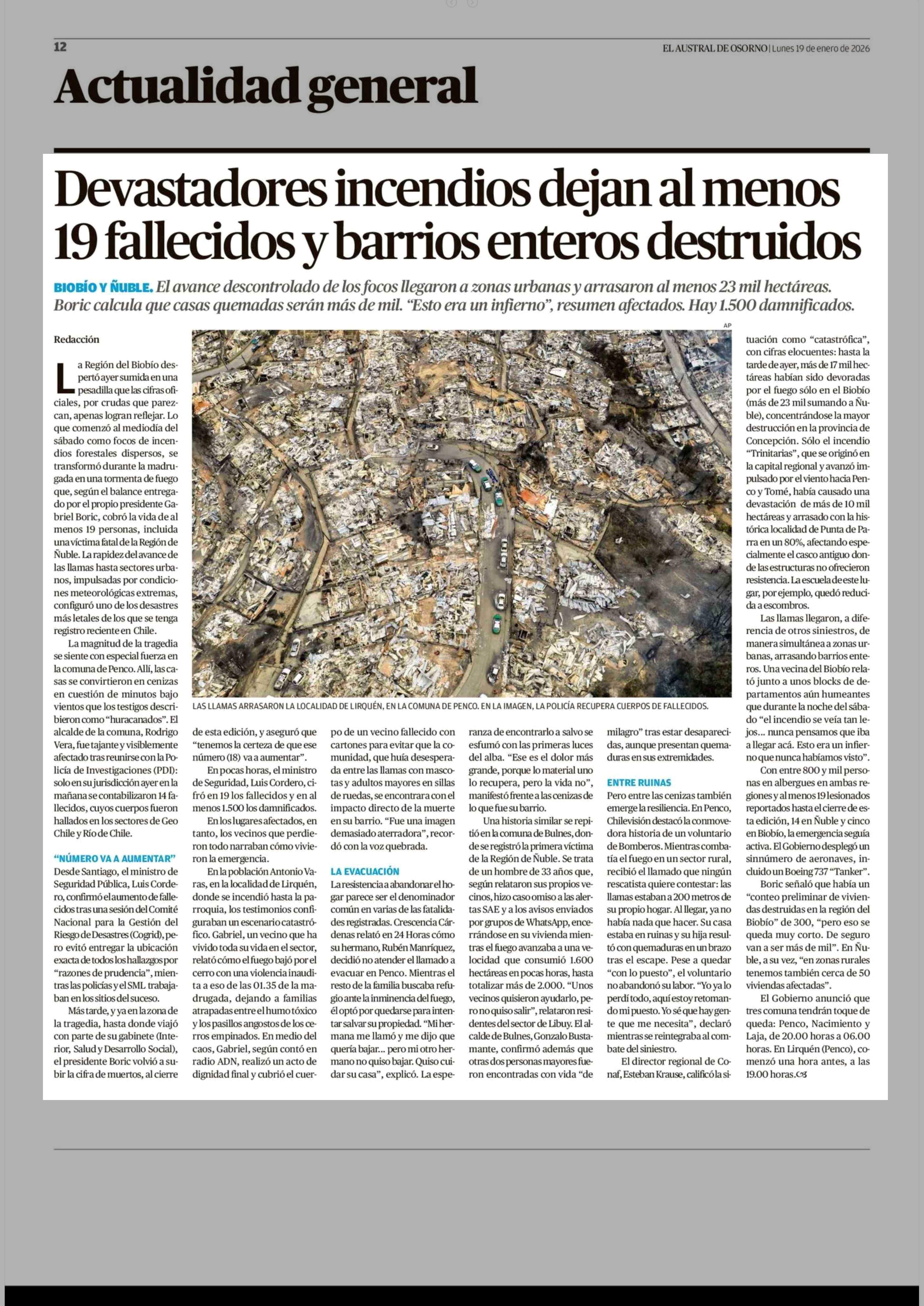 Devastadores incendios dejan al menos 19 fallecidos y barrios enteros destruidos 19-01-2026 El Austral de Osorno |