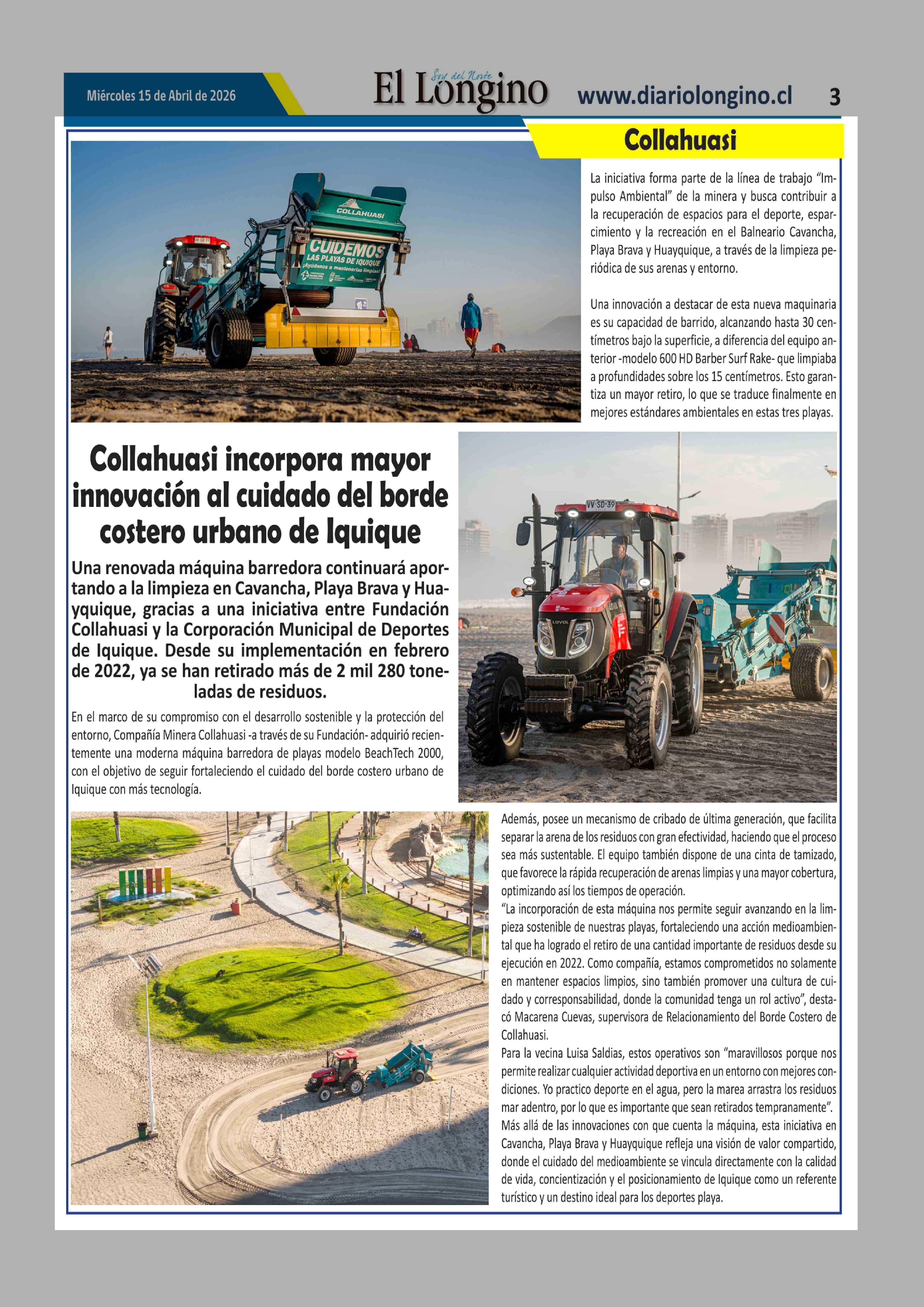 Collahuasi incorpora mayor innovación al cuidado del borde costero urbano de Iquique 15-04-2026 El Longino |