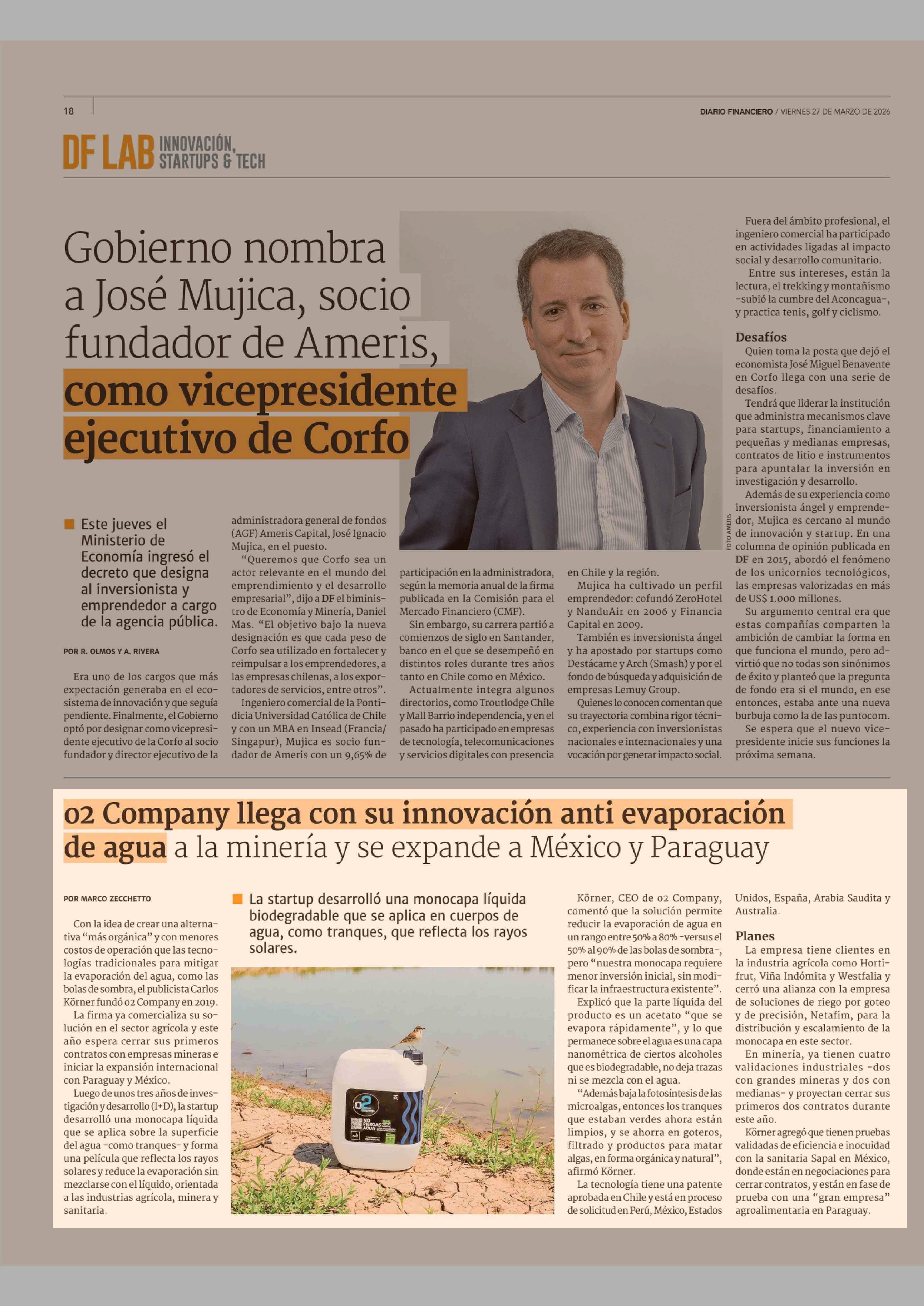 02 Company llega con su innovación anti evaporación de agua a la minería y se expande a México y Paraguay 27-03-2026 Diario Financiero |