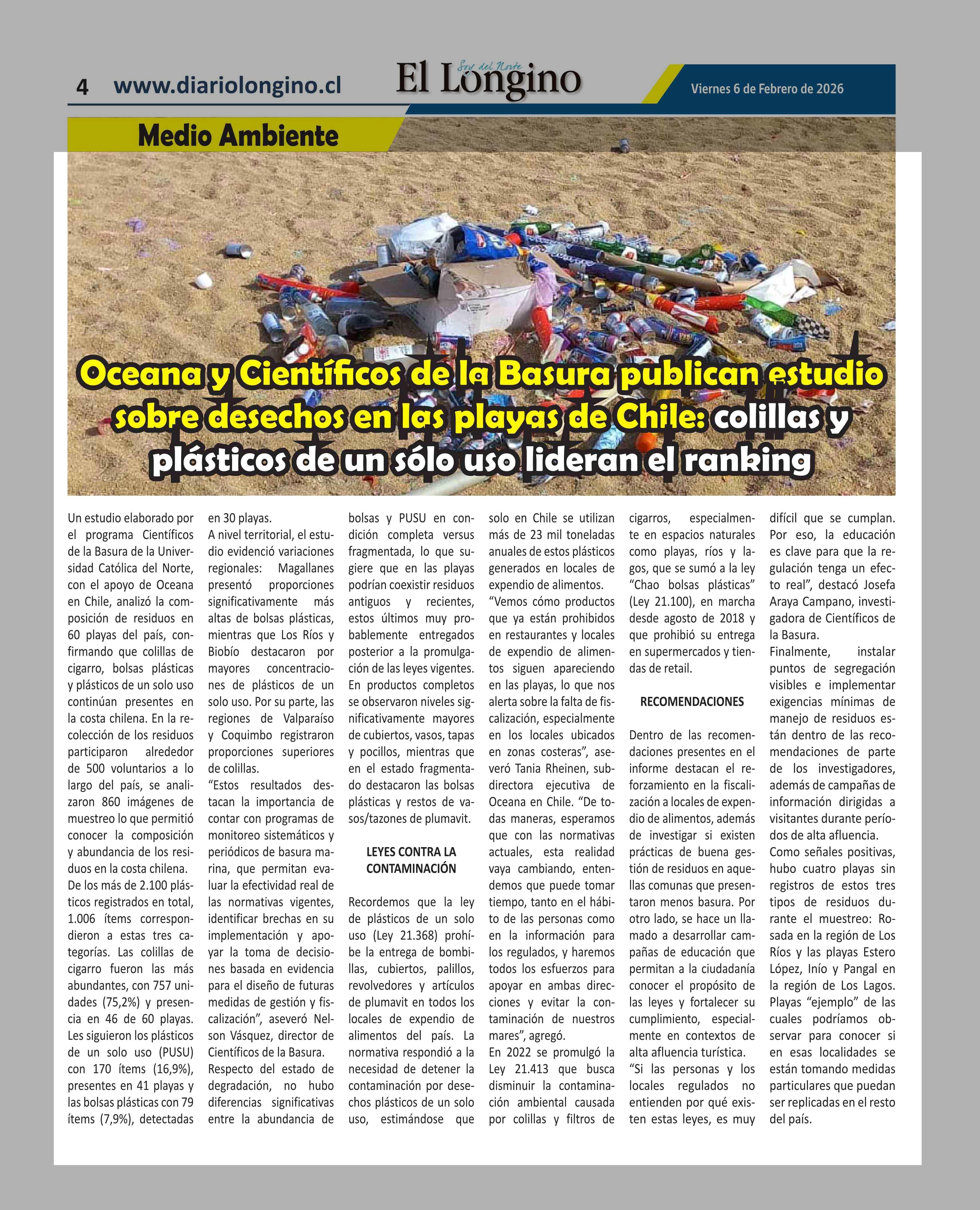 Título: Oceana y Científicos de la Basura a publican estudio sobre desechos en las playas de Chile; colillas y plásticos de un sólo uso lideran el ranking