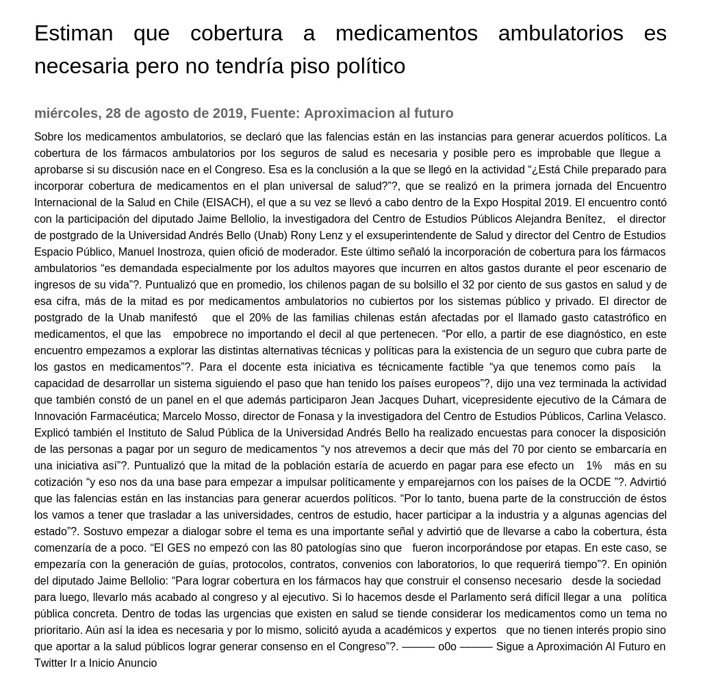 Sobre los medicamentos ambulatorios, se declaró que las falencias están en las instancias para generar acuerdos políticos. La cobertura de los fármacos ambulatorios por los seguros de salud es necesaria y posible pero es improbable que llegue a aprobarse si su discusión nace en el Congreso. Esa es la conclusión a la que se llegó en la actividad “¿Está Chile preparado para incorporar cobertura de medicamentos en el plan universal de salud?”, que se realizó en la primera jornada del Encuentro Internacional de la Salud en Chile (EISACH), el que a su vez se llevó a cabo dentro de la Expo Hospital 2019. El encuentro contó con la participación del diputado Jaime Bellolio, la investigadora del Centro de Estudios Públicos Alejandra Benítez, el director de postgrado de la Universidad Andrés Bello (Unab) Rony Lenz y el exsuperintendente de Salud y director del Centro de Estudios Espacio Público, Manuel Inostroza, quien ofició de moderador. Este último señaló la incorporación de cobertura para los fármacos ambulatorios “es demandada especialmente por los adultos mayores que incurren en altos gastos durante el peor escenario de ingresos de su vida”. Puntualizó que en promedio, los chilenos pagan de su bolsillo el 32 por ciento de sus gastos en salud y de esa cifra, más de la mitad es por medicamentos ambulatorios no cubiertos por los sistemas público y privado. El director de postgrado de la Unab manifestó que el 20% de las familias chilenas están afectadas por el llamado gasto catastrófico en medicamentos, el que las empobrece no importando el decil al que pertenecen. “Por ello, a partir de ese diagnóstico, en este encuentro empezamos a explorar las distintas alternativas técnicas y políticas para la existencia de un seguro que cubra parte de los gastos en medicamentos”. Para el docente esta iniciativa es técnicamente factible “ya que tenemos como país la capacidad de desarrollar un sistema siguiendo el paso que han tenido los países europeos”, dijo una vez terminada la actividad que también constó de un panel en el que además participaron Jean Jacques Duhart, vicepresidente ejecutivo de la Cámara de Innovación Farmacéutica; Marcelo Mosso, director de Fonasa y la investigadora del Centro de Estudios Públicos, Carlina Velasco. Explicó también el Instituto de Salud Pública de la Universidad Andrés Bello ha realizado encuestas para conocer la disposición de las personas a pagar por un seguro de medicamentos “y nos atrevemos a decir que más del 70 por ciento se embarcaría en una iniciativa así”. Puntualizó que la mitad de la población estaría de acuerdo en pagar para ese efecto un 1% más en su cotización “y eso nos da una base para empezar a impulsar políticamente y emparejarnos con los países de la OCDE ”. Advirtió que las falencias están en las instancias para generar acuerdos políticos. “Por lo tanto, buena parte de la construcción de éstos los vamos a tener que trasladar a las universidades, centros de estudio, hacer participar a la industria y a algunas agencias del estado”. Sostuvo empezar a dialogar sobre el tema es una importante señal y advirtió que de llevarse a cabo la cobertura, ésta comenzaría de a poco. “El GES no empezó con las 80 patologías sino que fueron incorporándose por etapas. En este caso, se empezaría con la generación de guías, protocolos, contratos, convenios con laboratorios, lo que requerirá tiempo”. En opinión del diputado Jaime Bellolio: “Para lograr cobertura en los fármacos hay que construir el consenso necesario desde la sociedad para luego, llevarlo más acabado al congreso y al ejecutivo. Si lo hacemos desde el Parlamento será difícil llegar a una política pública concreta. Dentro de todas las urgencias que existen en salud se tiende considerar los medicamentos como un tema no prioritario. Aún así la idea es necesaria y por lo mismo, solicitó ayuda a académicos y expertos que no tienen interés propio sino que aportar a la salud públicos lograr generar consenso en el Congreso”. ——— o0o ——— Sigue a Aproximación Al Futuro en Twitter Ir a Inicio Anuncios