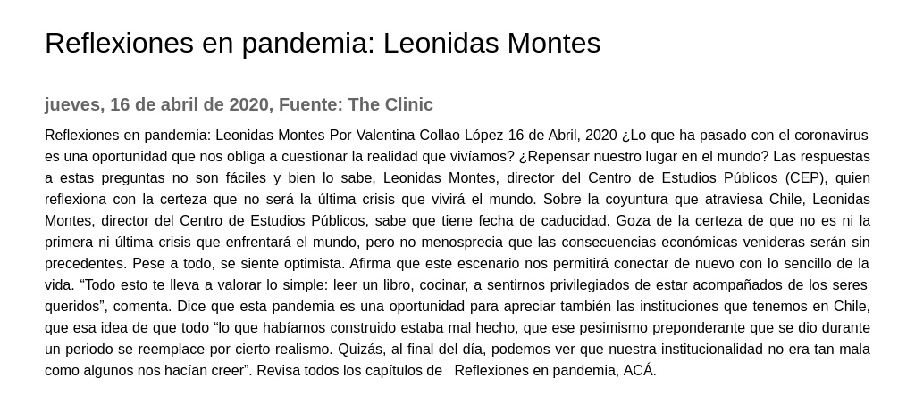 Reflexiones en pandemia: Leonidas Montes Por Valentina Collao López 16 de Abril, 2020 ¿Lo que ha pasado con el coronavirus es una oportunidad que nos obliga a cuestionar la realidad que vivíamos? ¿Repensar nuestro lugar en el mundo? Las respuestas a estas preguntas no son fáciles y bien lo sabe, Leonidas Montes, director del Centro de Estudios Públicos (CEP), quien reflexiona con la certeza que no será la última crisis que vivirá el mundo. Sobre la coyuntura que atraviesa Chile, Leonidas Montes, director del Centro de Estudios Públicos, sabe que tiene fecha de caducidad. Goza de la certeza de que no es ni la primera ni última crisis que enfrentará el mundo, pero no menosprecia que las consecuencias económicas venideras serán sin precedentes. Pese a todo, se siente optimista. Afirma que este escenario nos permitirá conectar de nuevo con lo sencillo de la vida. “Todo esto te lleva a valorar lo simple: leer un libro, cocinar, a sentirnos privilegiados de estar acompañados de los seres queridos”, comenta. Dice que esta pandemia es una oportunidad para apreciar también las instituciones que tenemos en Chile, que esa idea de que todo “lo que habíamos construido estaba mal hecho, que ese pesimismo preponderante que se dio durante un periodo se reemplace por cierto realismo. Quizás, al final del día, podemos ver que nuestra institucionalidad no era tan mala como algunos nos hacían creer”. Revisa todos los capítulos de Reflexiones en pandemia, ACÁ.