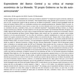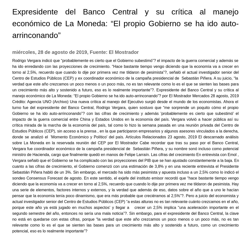 Rodrigo Vergara indicó que “probablemente es cierto que el Gobierno subestimó” el impacto de la guerra comercial y además se ha ido enredando con las proyecciones de crecimiento. “Hace bastante tiempo vengo diciendo que la economía va a crecer en torno al 2,5%, recuerdo que cuando lo dije por primera vez me tildaron de pesimista”, señaló el actual investigador senior del Centro de Estudios Públicos (CEP) y ex coordinador económico de la campaña presidencial de Sebastián Piñera. A su juicio, “la verdad que este año crezcamos un poco menos o un poco más, no es tan relevante como lo es el que se sienten las bases para un crecimiento más alto y sostenido a futuro, eso es lo realmente importante”. Expresidente del Banco Central y su crítica al manejo económico de La Moneda: “El propio Gobierno se ha ido auto-arrinconando” por El Mostrador Mercados 28 agosto, 2019 Crédito: Agencia UNO (Archivo) Una nueva crítica al manejo del Ejecutivo surgió desde el mundo de los economistas. Ahora el turno fue del expresidente del Banco Central, Rodrigo Vergara, quien sostuvo que “me sorprende un poquito cómo el propio Gobierno se ha ido auto-arrinconando” con las cifras de crecimiento y además "probablemente es cierto que subestimó" el impacto de la guerra comercial entre China y Estados Unidos en la economía del país. Vergara volvió a hacer pública así su crítica mirada de la marcha de la economía del país, tal como lo hizo la semana pasada en una reunión privada del Centro de Estudios Públicos (CEP), sin acceso a la prensa , en la que participaron empresarios y algunos asesores vinculados a la derecha, donde se analizó el "Momento Económico y Político" del país. Artículos Relacionados 23 agosto, 2019 El descarnado análisis sobre La Moneda en la reservada reunión del CEP por El Mostrador Cabe recordar que tras su paso por el Banco Central, Vergara fue coordinador económico de la campaña presidencial de Sebastián Piñera, y su nombre sonó incluso como potencial ministro de Hacienda, cargo que finalmente quedó en manos de Felipe Larraín. Las cifras del crecimiento En entrevista con Emol , Vergara señaló que el Gobierno se ha complicado con las proyecciones del PIB que se han ajustado constantemente a la baja. En cuanto a las cifras de crecimiento, el Gobierno comenzó con una estimación de 3,8% y en una reciente entrevista el Presidente Sebastián Piñera habló de un 3%. Sin embargo, el mercado ha sido más pesimista y apuesta incluso a un 2,5% como lo indicó el sondeo Consensus Forecast de agosto. En este sentido, el exjefe del instituto emisor recordó que “hace bastante tiempo vengo diciendo que la economía va a crecer en torno al 2,5%, recuerdo que cuando lo dije por primera vez me tildaron de pesimista. Hay una serie de elementos, factores internos y externos, y la verdad que además de eso, datos sobre el año que a uno le hacían pensar que la economía tenía poco dinamismo, que era más probable que creciéramos al 2,5%”. Pero a juicio del economista y actual investigador senior del Centro de Estudios Públicos (CEP) “a estas alturas no es tan relevante cuánto crezcamos en el año, porque este año ya está jugado en muchos aspectos" y llegar a crecer un 2,5% implica “una aceleración importante en el segundo semestre del año, entonces no sería una mala noticia”. Sin embargo, para el expresidente del Banco Central, la clave no está en quedarse con estas cifras, porque “la verdad que este año crezcamos un poco menos o un poco más, no es tan relevante como lo es el que se sienten las bases para un crecimiento más alto y sostenido a futuro, como un crecimiento potencial, eso es lo realmente importante”.