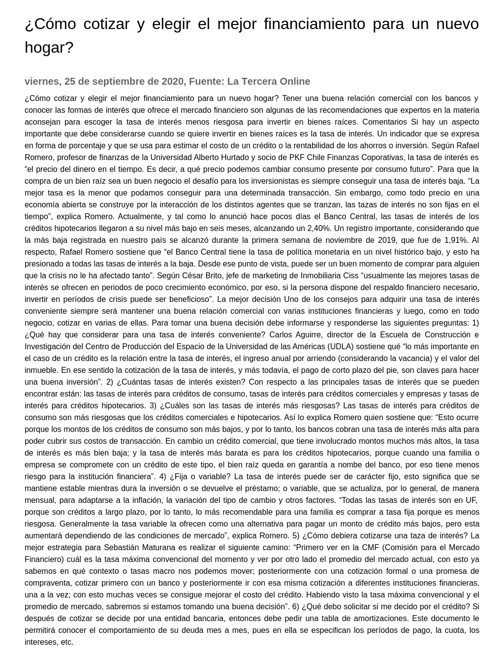 ¿ Cómo cotizar y elegir el mejor financiamiento para un nuevo hogar? Tener una buena relación comercial con los bancos y conocer las formas de interés que ofrece el mercado financiero son algunas de las recomendaciones que expertos en la materia aconsejan para escoger la tasa de interés menos riesgosa para invertir en bienes raíces. Comentarios Si hay un aspecto importante que debe considerarse cuando se quiere invertir en bienes raíces es la tasa de interés. Un indicador que se expresa en forma de porcentaje y que se usa para estimar el costo de un crédito o la rentabilidad de los ahorros o inversión. Según Rafael Romero, profesor de finanzas de la