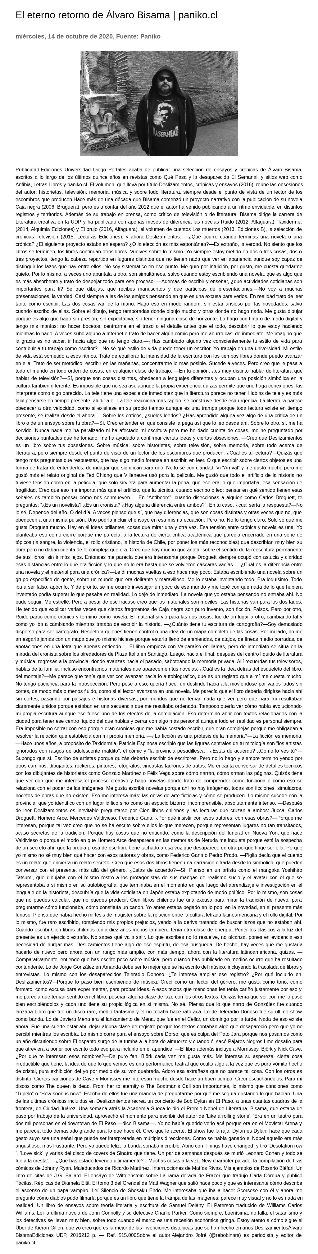 El eterno retorno de Álvaro Bisama | paniko.cl 14-10-2020 Paniko Publicidad Ediciones Universidad Diego Portales acaba de publicar una selección de ensayos y crónicas de Álvaro Bisama, escritos a lo largo de los últimos quince años en revistas como Qué Pasa y la ... |