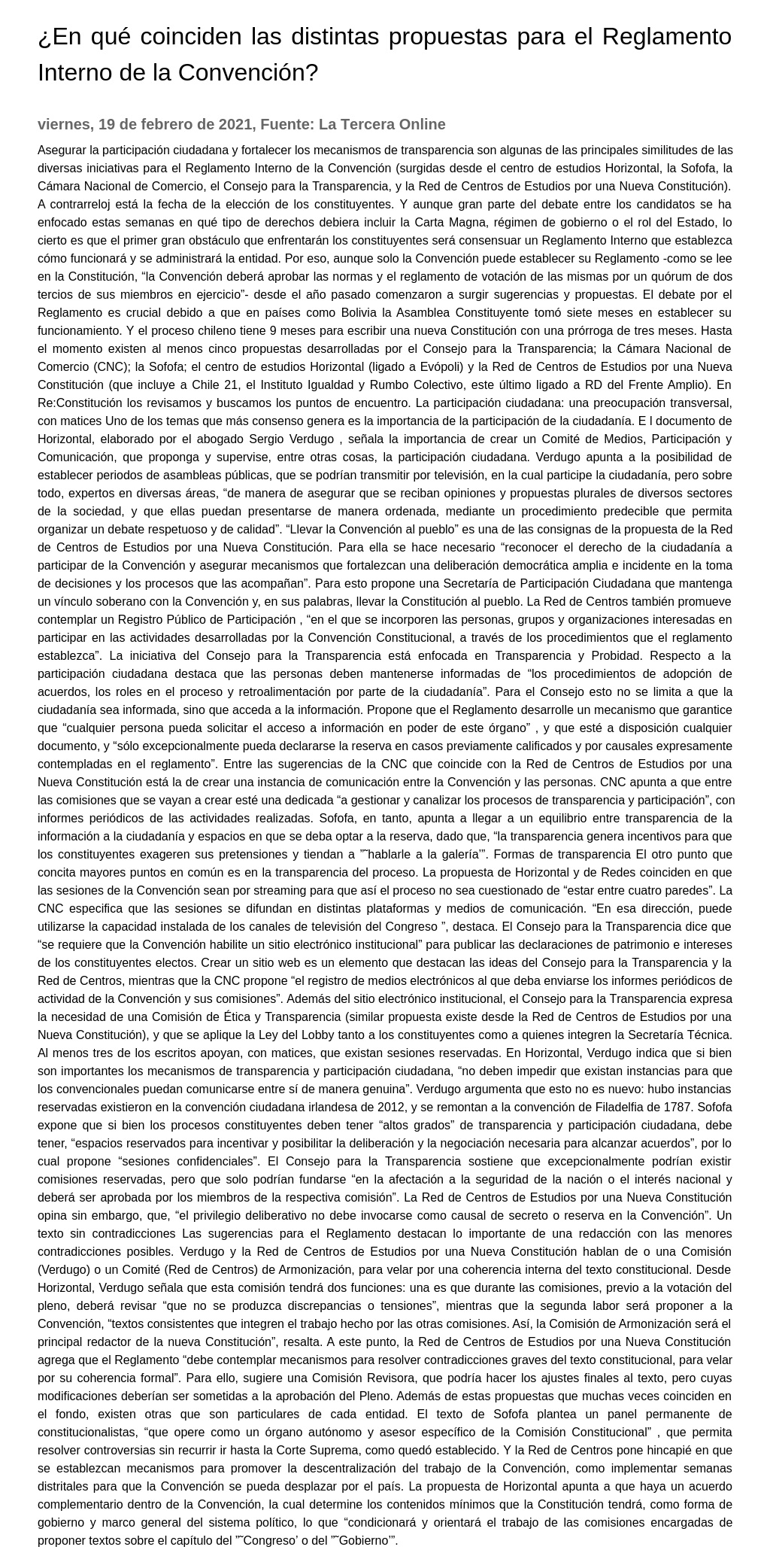 Hasta el momento existen al menos cinco propuestas desarrolladas por el Consejo para la Transparencia; la Cámara Nacional de Comercio (CNC); la Sofofa; el centro de estudios Horizontal (ligado a Evópoli) y la Red de Centros de Estudios por una Nueva Constitución (que incluye a Chile 21, el Instituto Igualdad y Rumbo Colectivo, este último ligado a RD del Frente Amplio). En Re:Constitución los revisamos y buscamos los puntos de encuentro. La participación ciudadana: una preocupación transversal, con matices Uno de los temas que más consenso genera es la importancia de la participación de la ciudadanía. E l documento de Horizontal, elaborado por el abogado Sergio Verdugo, señala la importancia de crear un Comité de Medios, Participación y Comunicación, que proponga y supervise, entre otras cosas, la participación ciudadana.