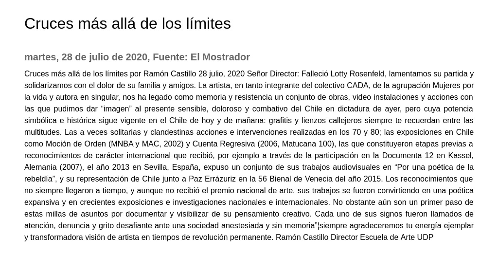 Cruces más allá de los límites por Ramón Castillo 28 julio, 2020 Señor Director: Falleció Lotty Rosenfeld, lamentamos su partida y solidarizamos con el dolor de su familia y amigos. La artista, en tanto integrante del colectivo CADA, de la agrupación Mujeres por la vida y autora en singular, nos ha legado como memoria y resistencia un conjunto de obras, video instalaciones y acciones con las que pudimos dar “imagen” al presente sensible, doloroso y combativo del Chile en dictadura de ayer, pero cuya potencia simbólica e histórica sigue vigente en el Chile de hoy y de mañana: grafitis y lienzos callejeros siempre te recuerdan entre las multitudes. Las a veces solitarias y clandestinas acciones e intervenciones realizadas en los 70 y 80; las exposiciones en Chile como Moción de Orden (MNBA y MAC, 2002) y Cuenta Regresiva (2006, Matucana 100), las que constituyeron etapas previas a reconocimientos de carácter internacional que recibió, por ejemplo a través de la participación en la Documenta 12 en Kassel, Alemania (2007), el año 2013 en Sevilla, España, expuso un conjunto de sus trabajos audiovisuales en “Por una poética de la rebeldía”, y su representación de Chile junto a Paz Errázuriz en la 56 Bienal de Venecia del año 2015. Los reconocimientos que no siempre llegaron a tiempo, y aunque no recibió el premio nacional de arte, sus trabajos se fueron convirtiendo en una poética expansiva y en crecientes exposiciones e investigaciones nacionales e internacionales. No obstante aún son un primer paso de estas millas de asuntos por documentar y visibilizar de su pensamiento creativo. Cada uno de sus signos fueron llamados de atención, denuncia y grito desafiante ante una sociedad anestesiada y sin memoria”¦siempre agradeceremos tu energía ejemplar y transformadora visión de artista en tiempos de revolución permanente. Ramón Castillo Director Escuela de Arte UDP|