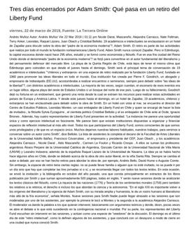 Andrés Muñoz Autor: Andrés Muñoz Vie 22 Mar 2019 | 01:11 pm Nicole Darat, Mascareño, Alejandra Carrasco, Nate Feltman, Terry Anker, Leonidas, Raquel Lázaro, Juan Obach y Cristóbal Bellolio. 19 académicos e intelectuales se enclaustaron en un hotel de Zapallar para discutir sobre la obra del “padre de la economía moderna”, Adam Smith. El retiro es parte de las actividades que realiza por todo el mundo la fundación norteamericana Liberty Fund. Adam Smith nunca conoció Zapallar. Pero sí Edimburgo, la capital escocesa donde nació hace 295 años, estudió y se formó como economista y filósofo. Fue en esa fría ciudad del Reino Unido donde el denominado “padre de la economía moderna” se forjó para convertirse en el autor fundamental del liberalismo y del pensamiento defensor del mercado libre. La playa de la Quinta Región de Chile, está lejos de tener el mismo clima que Edimburgo pero coinciden en que desde el jueves hasta el domingo, Smith será el principal tema de conversación de 19 académicos e intelectuales ”“chilenos y extranjeros- en una especie de retiro realizado por la fundación Liberty Fund, fundada en 1960 para promover las ideas liberales en todo el mundo. Esa institución fue creada por Pierre F. Goodrich, un abogado y empresario de Indianápolis (EE.UU), acostumbraba a realizar encuentros o seminarios, siempre para debatir sobre “las ideas de la libertad”, con distintos académicos e intelectuales. La mayoría de las veces, según cuentan, el escenario de esos eventos era un lugar idílico, alguna playa del oeste de Estados Unidos o un bosque del norte de ese país. Luego de su fallecimiento, Goodrich dejó su fortuna en un endowment, que generó una renta desde la cual se extraen los recursos para realizar estas actividades en países de Europa y América Latina. Y desde este jueves hasta el domingo, en un hotel de Zapallar, 19 académicos, chilenos y extranjeros se han enclaustrado para debatir sobre la obra de Smith. En un hotel con vista al mar, se encuentra el director del Centro de Estudios Públicos, Leonidas Montes -un casi embajador de Liberty Fund en Chile y quien se encargó de hacer la lista de invitados-, la filósofa Sylvia Eyzaguirre , el cientista político Cristóbal Bellolio y el ex embajador de Chile ante al Ocde, Ignacio Briones . Además, hay cuatro representantes de Liberty Fund presentes en la actividad. “La instancia me parece una oportunidad única y como ejercicio intelectual es fascinante. Me parece bien que existan instituciones dispuestas a organizar y financiar espacios de reflexión intelectual al más alto nivel. Todos los que participamos del Liberty Fund, somos conscientes de que somos unos privilegiados y de que es un espacio único. Muchos dejamos nuestras labores habituales, nuestros trabajos, para venirnos a conversar sobre un autor como Smith”, dice Bellolio. La lista de asistentes la completa el decano de la Facultad de Artes Liberales de la Universidad Adolfo Ibáñez, Francisco Covarrubias , el empresario y presidente del CEP, Juan Obach , y los académicos Alejandra Carrasco , Nicole Darat , Aldo Mascareño , Carmen Le Foulon y Ricardo Crespo . A ellos se suman los profesores argentinos Álvaro Perpere de la Universidad Católica de Argentina, Gonzalo Carrión de la Universidad Nacional de Villa María (UNVM) y Leandro Indavera; además de la española Raquel Lázaro de la Universidad de Navarra. La idea ya se había hecho hace algunos años en Chile, donde se debatió acerca de la obra de otro autor liberal, en la viña Santa Rita. Siempre se cambia el autor a debatir, por eso se han hecho retiros para abordar la obra de, por ejemplo, Andrés Bello, David Hume o Auguste Comte. Sin embargo, la especie de retiro tiene ciertas reglas: no se puede llevar familia o alguien que no esté invitado, no se puede ir por un día sino que hay que completar las tres jornadas sí o sí, y se recomienda llegar con todos los textos leídos. En esta ocasión, se envió la invitación y la bibliografía en octubre del año pasado, una que consta principalmente en extractos de los libros publicados por Smith y que suman aproximadamente 500 páginas, todas en inglés. Y serán nueve sesiones donde se analizarán los textos clásicos del filósofo, como La riqueza de las naciones (1776) y Teoría de los sentimientos morales (1759) pero también los relativos a la retórica, el derecho e incluso los que abordan la ciencia y la astronomía. “En el siglo XXI es importante volver a los orígenes del liberalismo y la vigencia de Adam Smith, con su mirada amplia y humanista, le da un rostro humano al liberalismo más allá de la fría economía”, señala Montes. Nueve sesiones para Smith Nadie puede llegar atrasado a las sesiones que son moderadas por uno de los asistentes, por ejemplo la primera le tocó a Montes y la segunda a la académica Alejandra Carrasco. El moderador va dando la palabra a los que quieran intervenir, básicamente con argumentos teóricos y donde, dicen, pocas veces se abre el debate a lo que está sucediendo en la contingencia nacional o mundial. Por su parte, los representantes del Liberty Fund escuchan sin intervenir en las sesiones, y actúan como una especie de “veedores” de la discusión. El domingo es el último día de este “retiro intelectual”, como lo definen algunos de los asistentes, y que concluirá con un desayuno a modo de cierre en una ciudad que nunca conoció Smith.
