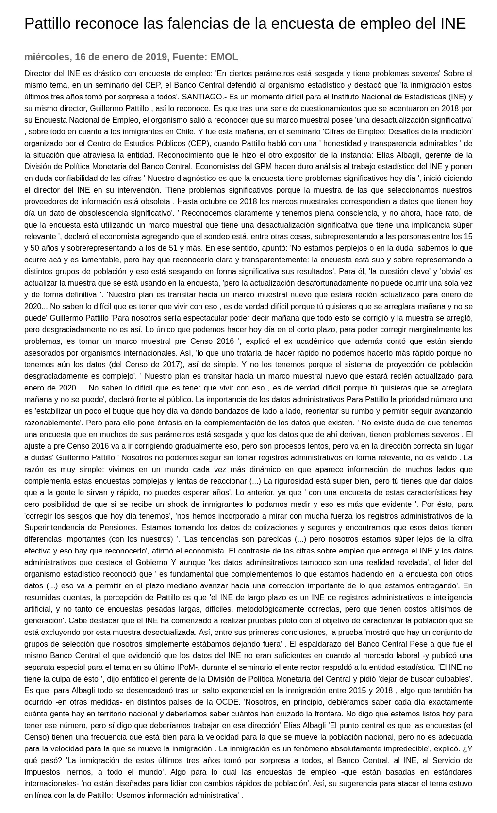 Director del INE es drástico con encuesta de empleo: "En ciertos parámetros está sesgada y tiene problemas severos" Sobre el mismo tema, en un seminario del CEP, el Banco Central defendió al organismo estadístico y destacó que "la inmigración estos últimos tres años tomó por sorpresa a todos". SANTIAGO.- Es un momento difícil para el Instituto Nacional de Estadísticas (INE) y su mismo director, Guillermo Pattillo , así lo reconoce. Es que tras una serie de cuestionamientos que se acentuaron en 2018 por su Encuesta Nacional de Empleo, el organismo salió a reconocer que su marco muestral posee "una desactualización significativa" , sobre todo en cuanto a los inmigrantes en Chile. Y fue esta mañana, en el seminario "Cifras de Empleo: Desafíos de la medición" organizado por el Centro de Estudios Públicos (CEP), cuando Pattillo habló con una " honestidad y transparencia admirables " de la situación que atraviesa la entidad. Reconocimiento que le hizo el otro expositor de la instancia: Elías Albagli, gerente de la División de Política Monetaria del Banco Central. Economistas del GPM hacen duro análisis al trabajo estadístico del INE y ponen en duda confiabilidad de las cifras " Nuestro diagnóstico es que la encuesta tiene problemas significativos hoy día ", inició diciendo el director del INE en su intervención. "Tiene problemas significativos porque la muestra de las que seleccionamos nuestros proveedores de información está obsoleta . Hasta octubre de 2018 los marcos muestrales correspondían a datos que tienen hoy día un dato de obsolescencia significativo". " Reconocemos claramente y tenemos plena consciencia, y no ahora, hace rato, de que la encuesta está utilizando un marco muestral que tiene una desactualización significativa que tiene una implicancia súper relevante ", declaró el economista agregando que el sondeo está, entre otras cosas, subrepresentando a las personas entre los 15 y 50 años y sobrerepresentando a los de 51 y más. En ese sentido, apuntó: "No estamos perplejos o en la duda, sabemos lo que ocurre acá y es lamentable, pero hay que reconocerlo clara y transparentemente: la encuesta está sub y sobre representando a distintos grupos de población y eso está sesgando en forma significativa sus resultados". Para él, "la cuestión clave" y "obvia" es actualizar la muestra que se está usando en la encuesta, "pero la actualización desafortunadamente no puede ocurrir una sola vez y de forma definitiva ". "Nuestro plan es transitar hacia un marco muestral nuevo que estará recién actualizado para enero de 2020... No saben lo difícil que es tener que vivir con eso , es de verdad difícil porque tú quisieras que se arreglara mañana y no se puede" Guillermo Pattillo "Para nosotros sería espectacular poder decir mañana que todo esto se corrigió y la muestra se arregló, pero desgraciadamente no es así. Lo único que podemos hacer hoy día en el corto plazo, para poder corregir marginalmente los problemas, es tomar un marco muestral pre Censo 2016 ", explicó el ex académico que además contó que están siendo asesorados por organismos internacionales. Así, "lo que uno trataría de hacer rápido no podemos hacerlo más rápido porque no tenemos aún los datos (del Censo de 2017), así de simple. Y no los tenemos porque el sistema de proyección de población desgraciadamente es complejo". " Nuestro plan es transitar hacia un marco muestral nuevo que estará recién actualizado para enero de 2020 ... No saben lo difícil que es tener que vivir con eso , es de verdad difícil porque tú quisieras que se arreglara mañana y no se puede", declaró frente al público. La importancia de los datos administrativos Para Pattillo la prioridad número uno es "estabilizar un poco el buque que hoy día va dando bandazos de lado a lado, reorientar su rumbo y permitir seguir avanzando razonablemente". Pero para ello pone énfasis en la complementación de los datos que existen. " No existe duda de que tenemos una encuesta que en muchos de sus parámetros está sesgada y que los datos que de ahí derivan, tienen problemas severos . El ajuste a pre Censo 2016 va a ir corrigiendo gradualmente eso, pero son procesos lentos, pero va en la dirección correcta sin lugar a dudas" Guillermo Pattillo " Nosotros no podemos seguir sin tomar registros administrativos en forma relevante, no es válido . La razón es muy simple: vivimos en un mundo cada vez más dinámico en que aparece información de muchos lados que complementa estas encuestas complejas y lentas de reaccionar (...) La rigurosidad está super bien, pero tú tienes que dar datos que a la gente le sirvan y rápido, no puedes esperar años". Lo anterior, ya que " con una encuesta de estas características hay cero posibilidad de que si se recibe un shock de inmigrantes lo podamos medir y eso es más que evidente ". Por ésto, para "corregir los sesgos que hoy día tenemos", "nos hemos incorporado a mirar con mucha fuerza los registros administrativos de la Superintendencia de Pensiones. Estamos tomando los datos de cotizaciones y seguros y encontramos que esos datos tienen diferencias importantes (con los nuestros) ". "Las tendencias son parecidas (...) pero nosotros estamos súper lejos de la cifra efectiva y eso hay que reconocerlo", afirmó el economista. El contraste de las cifras sobre empleo que entrega el INE y los datos administrativos que destaca el Gobierno Y aunque "los datos adminsitrativos tampoco son una realidad revelada", el líder del organismo estadístico reconoció que " es fundamental que complementemos lo que estamos haciendo en la encuesta con otros datos (...) eso va a permitir en el plazo mediano avanzar hacia una corrección importante de lo que estamos entregando". En resumidas cuentas, la percepción de Pattillo es que "el INE de largo plazo es un INE de registros administrativos e inteligencia artificial, y no tanto de encuestas pesadas largas, difíciles, metodol