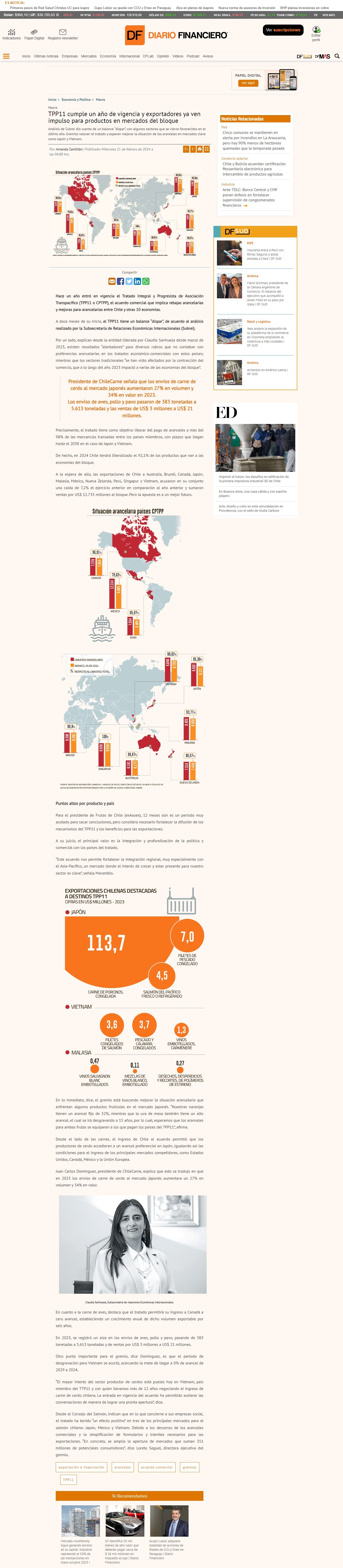 Desde el lado de las carnes, el ingreso de Chile al acuerdo permitió que los productores de cerdo accedieran a un arancel preferencial en Japón, igualando así las condiciones para el ingreso de los principales mercados competidores, como Estados Unidos, Canadá, México y la Unión Europea. Juan Carlos Domínguez, presidente de ChileCarne, explica que esto se tradujo en que en 2023 los envíos de carne de cerdo al mercado japonés aumentara un 27% en volumen y 34% en valor. Claudia Sanhueza, Subsecretaria de relaciones Económicas Internacionales. En cuanto a la carne de aves, destaca que el tratado permitirá su ingreso a Canadá a cero arancel, estableciendo un crecimiento anual de dicho volumen exportable por seis años. En 2023, se registró un alza en los envíos de aves, pollo y pavo, pasando de 383 toneladas a 5.613 toneladas y de ventas por US$ 3 millones a US$ 21 millones. Otro punto importante para el gremio, dice Domínguez, es que el periodo de desgravación para Vietnam se acortó, acercando la meta de llegar a 0% de arancel de 2029 a 2024. “El mayor interés del sector productor de cerdos está puesto hoy en Vietnam, país miembro del TTP11 y con quien llevamos más de 12 años negociando el ingreso de carne de cerdo chilena. La entrada en vigencia del acuerdo ha permitido acelerar las conversaciones de manera de lograr una pronta apertura”, dice.