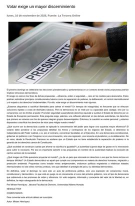 En definitiva, votar el domingo no será solo un acto de preferencia política, sino una expresión de compromiso moral, constitucional y democrático. Lo que está en juego no es únicamente el curso del próximo gobierno, sino el tipo de democracia que sobrevivirá a las promesas de orden y eficiencia. Un voto exigente, informado y consciente del valor de la libertad es, en definitiva, la mejor salvaguarda de la democracia.