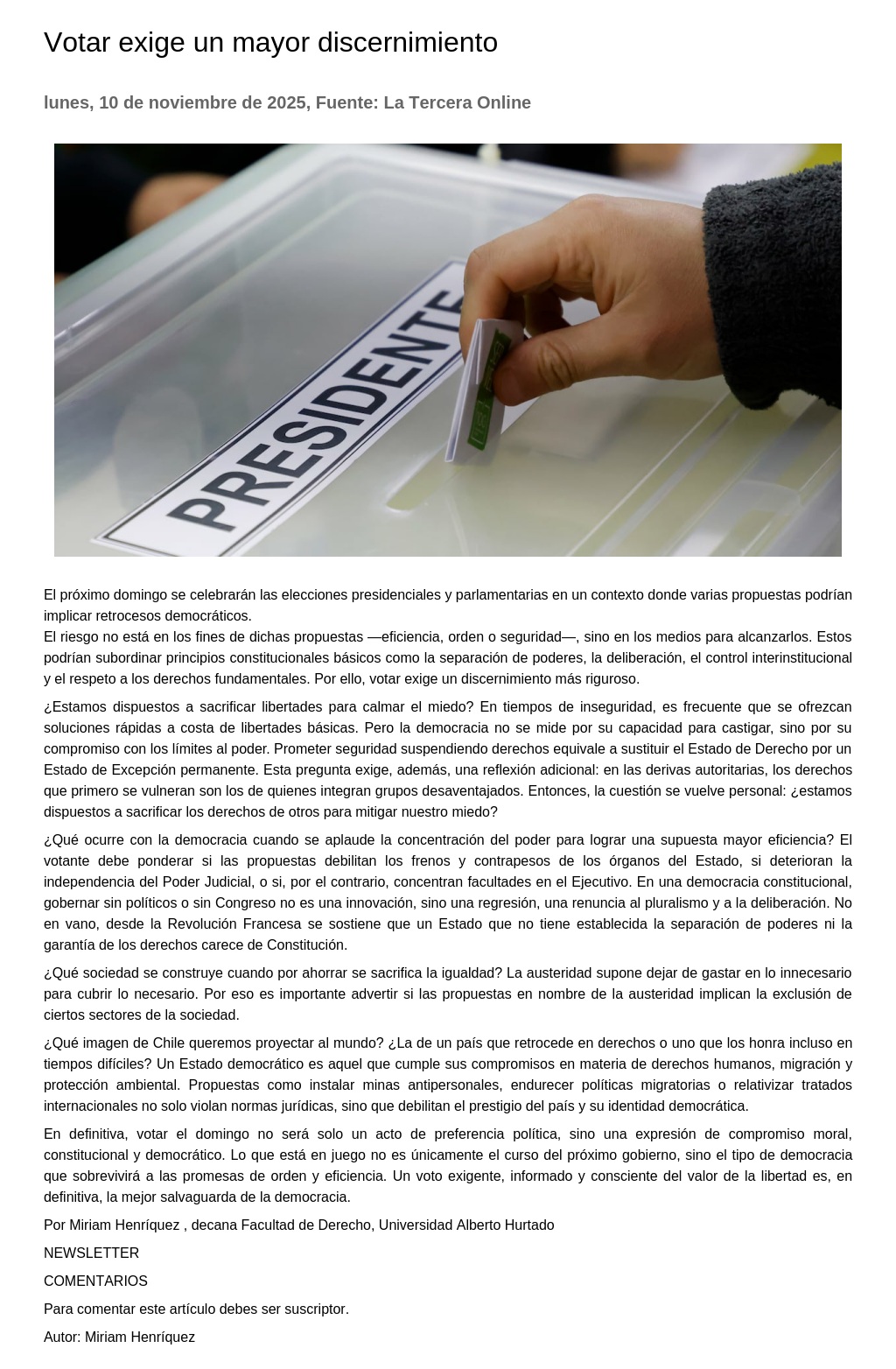 Votar exige un mayor discernimiento 10-11-2025 La Tercera Online El próximo domingo se celebrarán las elecciones presidenciales y parlamentarias en un contexto donde varias propuestas podrían implicar retrocesos democráticos. El riesgo no está en los fines de ... |