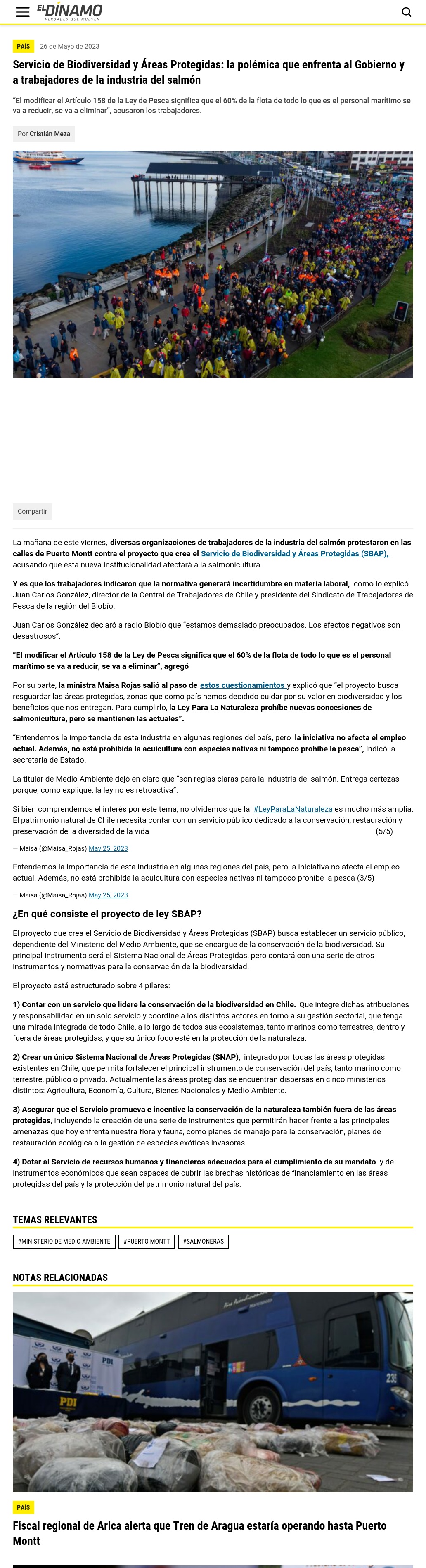 El patrimonio natural de Chile necesita contar con un servicio público dedicado a la conservación, restauración y preservación de la diversidad de la vida ðŸ³ðŸŒ³ðŸŒŠðŸ§(5/5) — Maisa (@Maisa_Rojas) May 25,2023 Entendemos la importancia de esta industria en algunas regiones del país, pero la iniciativa no afecta el empleo actual.