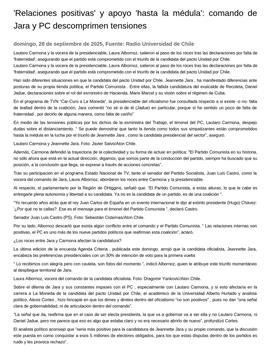En medio de las tensiones públicas por los dichos de la exministra del Trabajo, el timonel del PC, Lautaro Carmona, despejo dudas sobre el distanciamiento. “ Se puede demostrar que tanto la tienda como todos sus simpatizantes están comprometidos hasta la médula en la lucha por el triunfo de Jeannette Jara, como la candidata presidencial del sector”, aseguró.