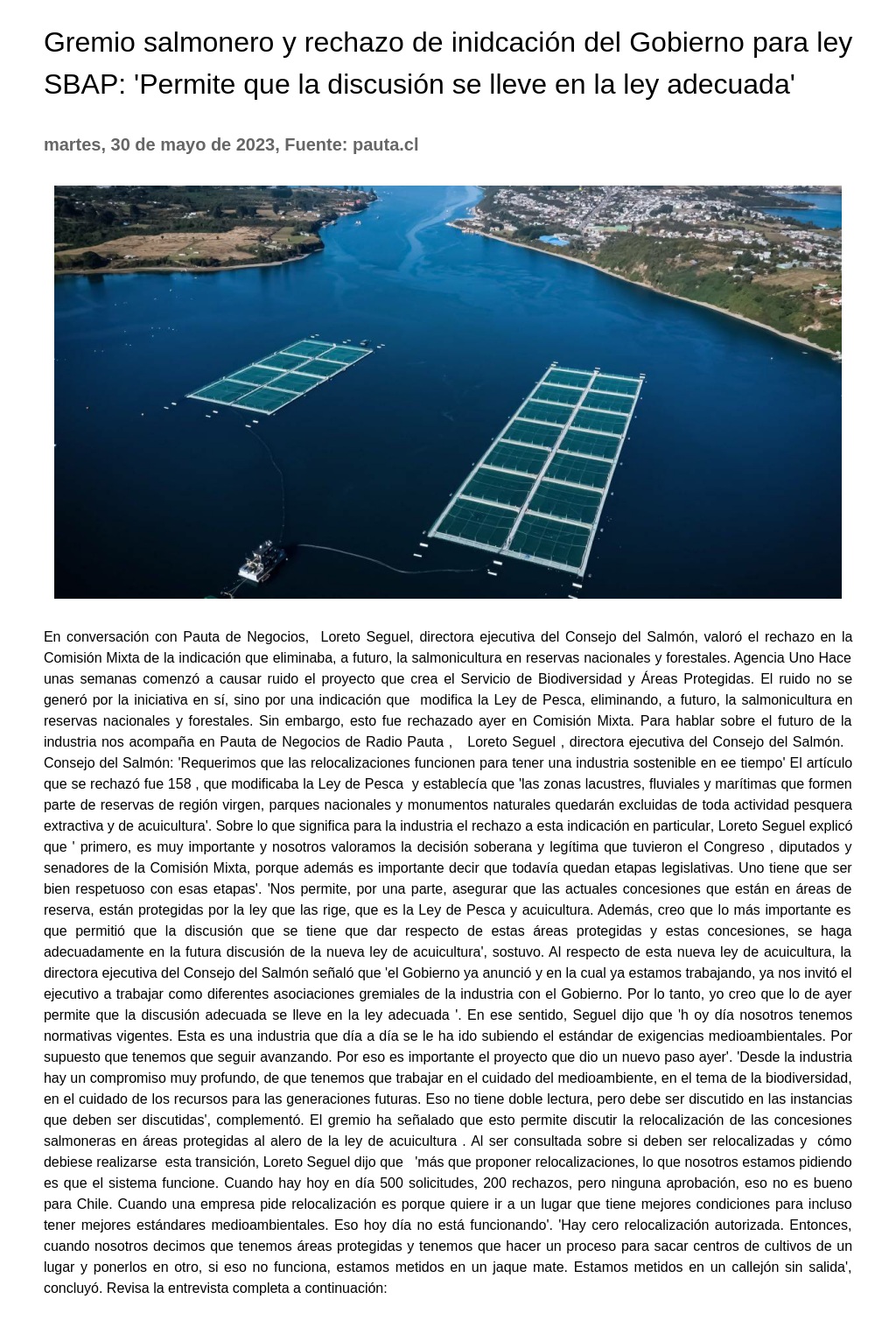 Gremio salmonero y rechazo de inidcación del Gobierno para ley SBAP: "Permite que la discusión se lleve en la ley adecuada" 30-05-2023 pauta.cl En conversación con Pauta de Negocios, Loreto Seguel, directora ejecutiva del Consejo del Salmón, valoró el rechazo en la Comisión Mixta de la indicación que eliminaba, a futuro, la salmonicult... |