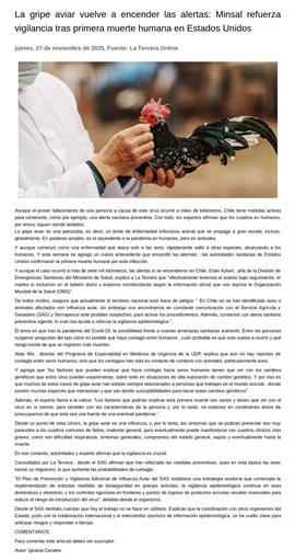 La gripe aviar vuelve a encender las alertas: Minsal refuerza vigilancia tras primera muerte humana en Estados Unidos 27-11-2025 La Tercera Online Aunque el primer fallecimiento de una persona a causa de este virus ocurrió a miles de kilómetros, Chile tiene medidas activas para contenerlo, como por ejemplo, una alerta sanitaria preventiva. ... |