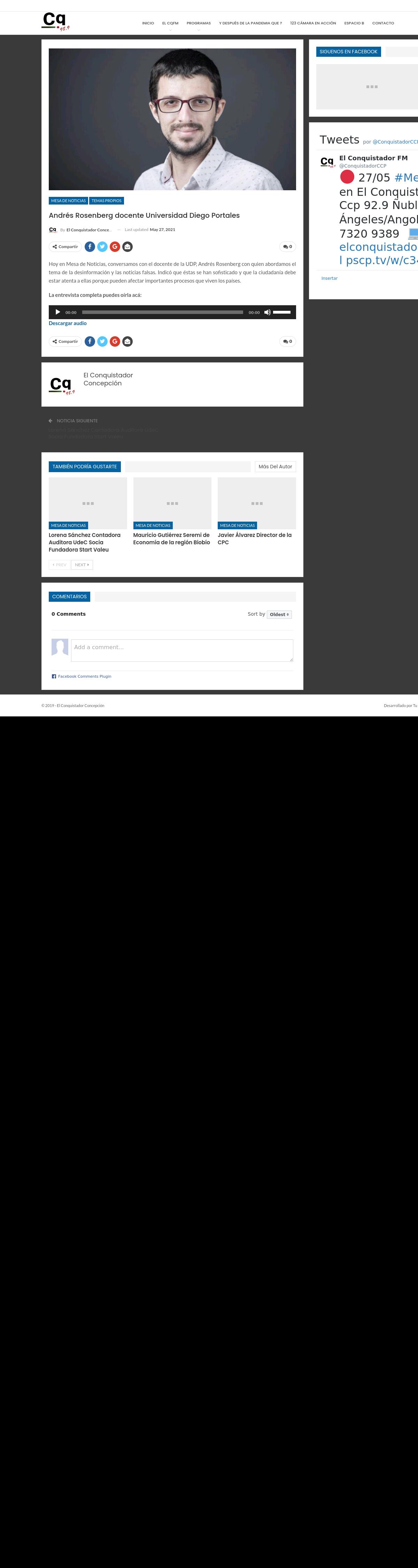 Andrés Rosenberg docente Universidad Diego Portales 27-05-2021 Elconquistadorconcepcion Hoy en Mesa de Noticias, conversamos con el docente de la UDP, Andrés Rosenberg con quien abordamos el tema de la desinformación y las noticias falsas. Indicó que éstas se han sofisticado y que l... |