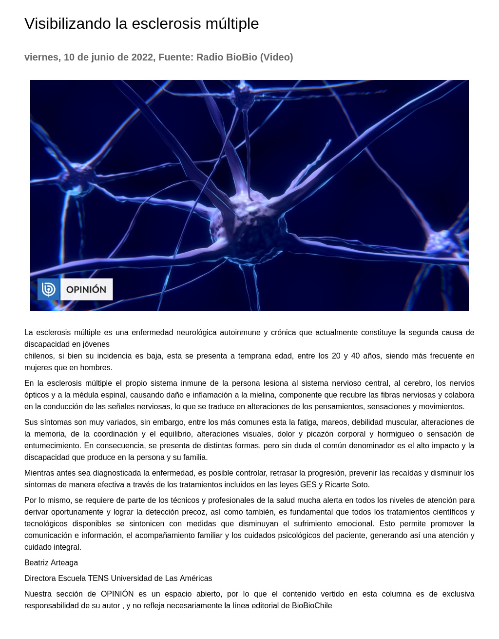 Visibilizando la esclerosis múltiple 10-06-2022 Radio BioBio (Video) La esclerosis múltiple es una enfermedad neurológica autoinmune y crónica que actualmente constituye la segunda causa de discapacidad en jóvenes chilenos, si bien su incidencia es baja, esta se ... |