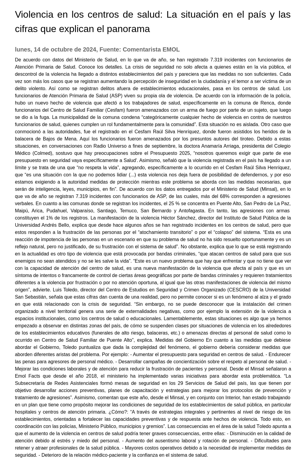 Todo esto, en coordinación con las policías, Ministerio Público, municipios y gremios”. Las consecuencias en el área de la salud Toledo apunta a que el aumento de la violencia en centros de salud podría tener graves consecuencias, entre ellas: - Disminución en la calidad de atención debido al estrés y miedo del personal. - Aumento del ausentismo laboral y rotación de personal. - Dificultades para retener y atraer profesionales de la salud pública. - Mayores costos operativos debido a la necesidad de implementar medidas de seguridad. - Deterioro de la relación médico-paciente y la confianza en el sistema de salud.
