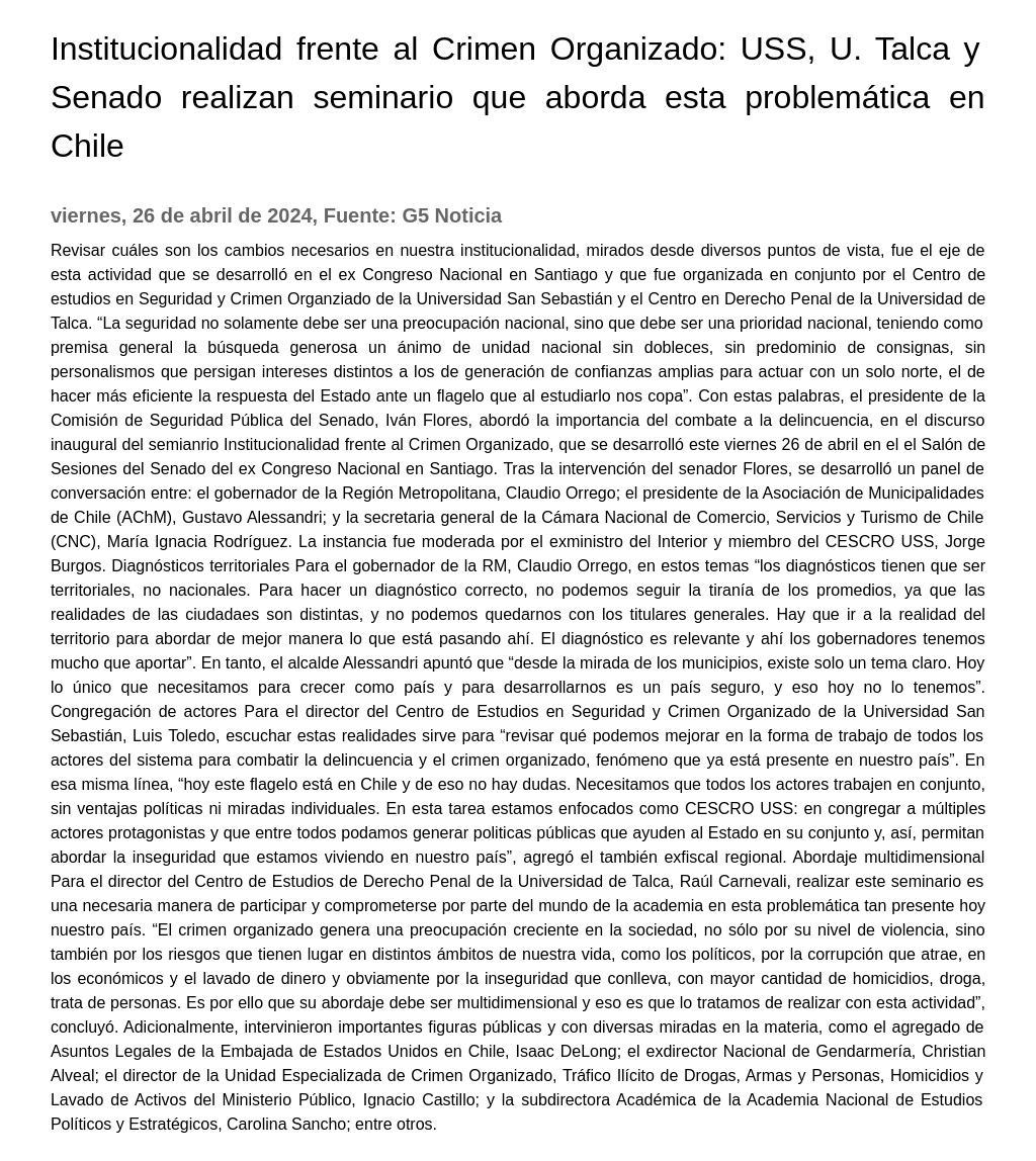 Institucionalidad frente al Crimen Organizado: USS, U. Talca y Senado realizan seminario que aborda esta problemática en Chile