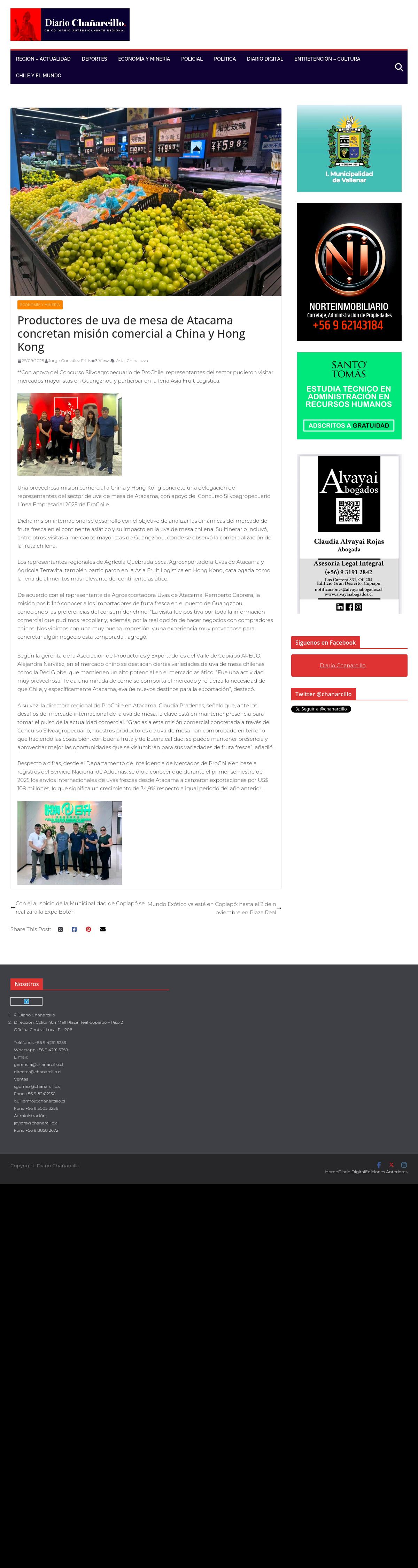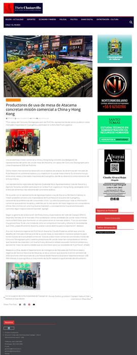 Productores de uva de mesa de Atacama concretan misión comercial a China y Hong Kong 29-09-2025 Diario Chañarcillo **Con apoyo del Concurso Silvoagropecuario de ProChile, representantes del sector pudieron visitar mercados mayoristas en Guangzhou y participar en la feria Asia Fruit Logistica. Una provechosa... |