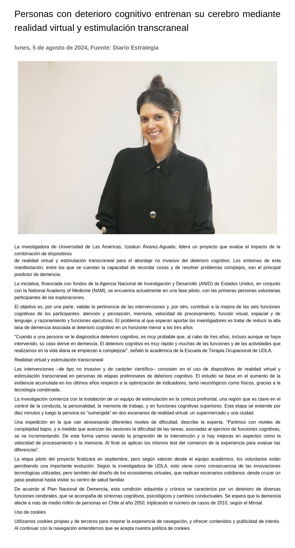 Personas con deterioro cognitivo entrenan su cerebro mediante realidad virtual y estimulación transcraneal 05-08-2024 Diario Estrategia La investigadora de Universidad de Las Américas, Izaskun Álvarez-Aguado, lidera un proyecto que evalúa el impacto de la combinación de dispositivos de realidad virtual y estimulación transcranea... |