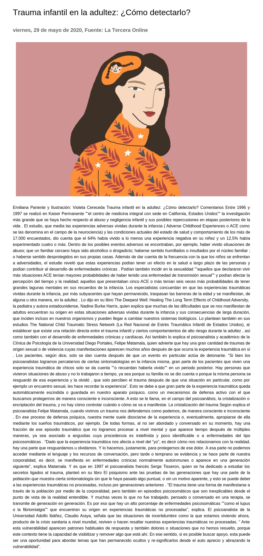 Emiliana Pariente y Ilustración: Violeta Cereceda Trauma infantil en la adultez: ¿ Cómo detectarlo? Comentarios Entre 1995 y 1997 se realizó en Kaiser Permanente ”“el centro de medicina integral con sede en California, Estados Unidos”“ la investigación más grande que se haya hecho respecto al abuso y negligencia infantil y sus posibles repercusiones en etapas posteriores de la vida.