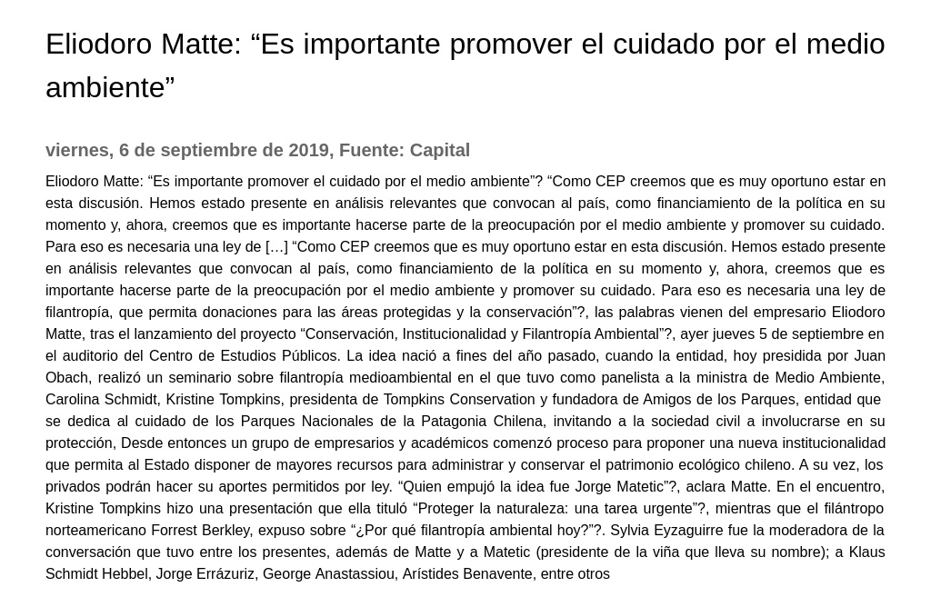 Eliodoro Matte: “Es importante promover el cuidado por el medio ambiente” “Como CEP creemos que es muy oportuno estar en esta discusión. Hemos estado presente en análisis relevantes que convocan al país, como financiamiento de la política en su momento y, ahora, creemos que es importante hacerse parte de la preocupación por el medio ambiente y promover su cuidado. Para eso es necesaria una ley de […] “Como CEP creemos que es muy oportuno estar en esta discusión. Hemos estado presente en análisis relevantes que convocan al país, como financiamiento de la política en su momento y, ahora, creemos que es importante hacerse parte de la preocupación por el medio ambiente y promover su cuidado. Para eso es necesaria una ley de filantropía, que permita donaciones para las áreas protegidas y la conservación”, las palabras vienen del empresario Eliodoro Matte, tras el lanzamiento del proyecto “Conservación, Institucionalidad y Filantropía Ambiental”, ayer jueves 5 de septiembre en el auditorio del Centro de Estudios Públicos. La idea nació a fines del año pasado, cuando la entidad, hoy presidida por Juan Obach, realizó un seminario sobre filantropía medioambiental en el que tuvo como panelista a la ministra de Medio Ambiente, Carolina Schmidt, Kristine Tompkins, presidenta de Tompkins Conservation y fundadora de Amigos de los Parques, entidad que se dedica al cuidado de los Parques Nacionales de la Patagonia Chilena, invitando a la sociedad civil a involucrarse en su protección, Desde entonces un grupo de empresarios y académicos comenzó proceso para proponer una nueva institucionalidad que permita al Estado disponer de mayores recursos para administrar y conservar el patrimonio ecológico chileno. A su vez, los privados podrán hacer su aportes permitidos por ley. “Quien empujó la idea fue Jorge Matetic”, aclara Matte. En el encuentro, Kristine Tompkins hizo una presentación que ella tituló “Proteger la naturaleza: una tarea urgente”, mientras que el filántropo norteamericano Forrest Berkley, expuso sobre “¿Por qué filantropía ambiental hoy?”. Sylvia Eyzaguirre fue la moderadora de la conversación que tuvo entre los presentes, además de Matte y a Matetic (presidente de la viña que lleva su nombre); a Klaus Schmidt Hebbel, Jorge Errázuriz, George Anastassiou, Arístides Benavente, entre otros.
