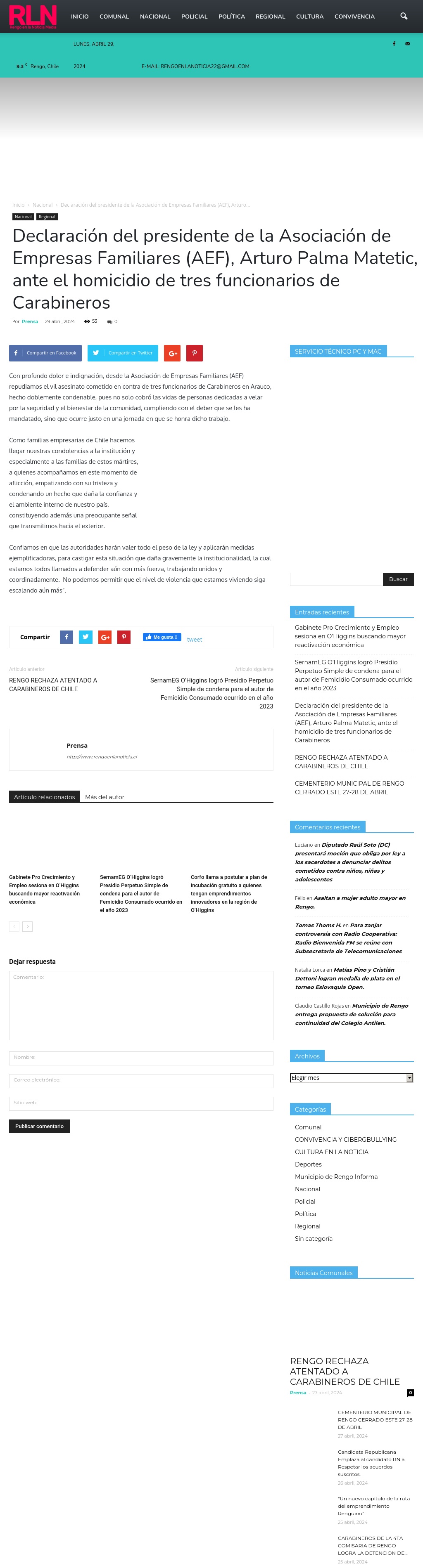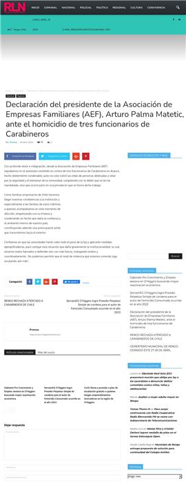 Declaración del presidente de la Asociación de Empresas Familiares (AEF), Arturo Palma Matetic, ante el homicidio de tres funcionarios de Carabineros 29-04-2024 Rengo en la Noticia Con profundo dolor e indignación, desde la Asociación de Empresas Familiares (AEF) repudiamos el vil asesinato cometido en contra de tres funcionarios de Carabineros en Arauco, hecho doblemente ... |