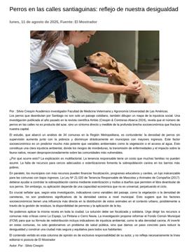 Perros en las calles santiaguinas: reflejo de nuestra desigualdad 11-08-2025 El Mostrador Por : Silvio Crespín Académico investigador Facultad de Medicina Veterinaria y Agronomía Universidad de Las Américas. Los perros que deambulan por Santiago no son solo un paisaje cotidiano, tam... |