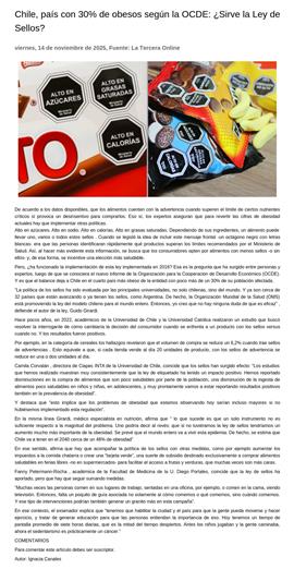 Chile, país con 30% de obesos según la OCDE: ¿Sirve la Ley de Sellos? 14-11-2025 La Tercera Online De acuerdo a los datos disponibles, que los alimentos cuenten con la advertencia cuando superen el límite de ciertos nutrientes críticos sí provoca un desinsentivo para comprarlos. Eso sí, los ex... |